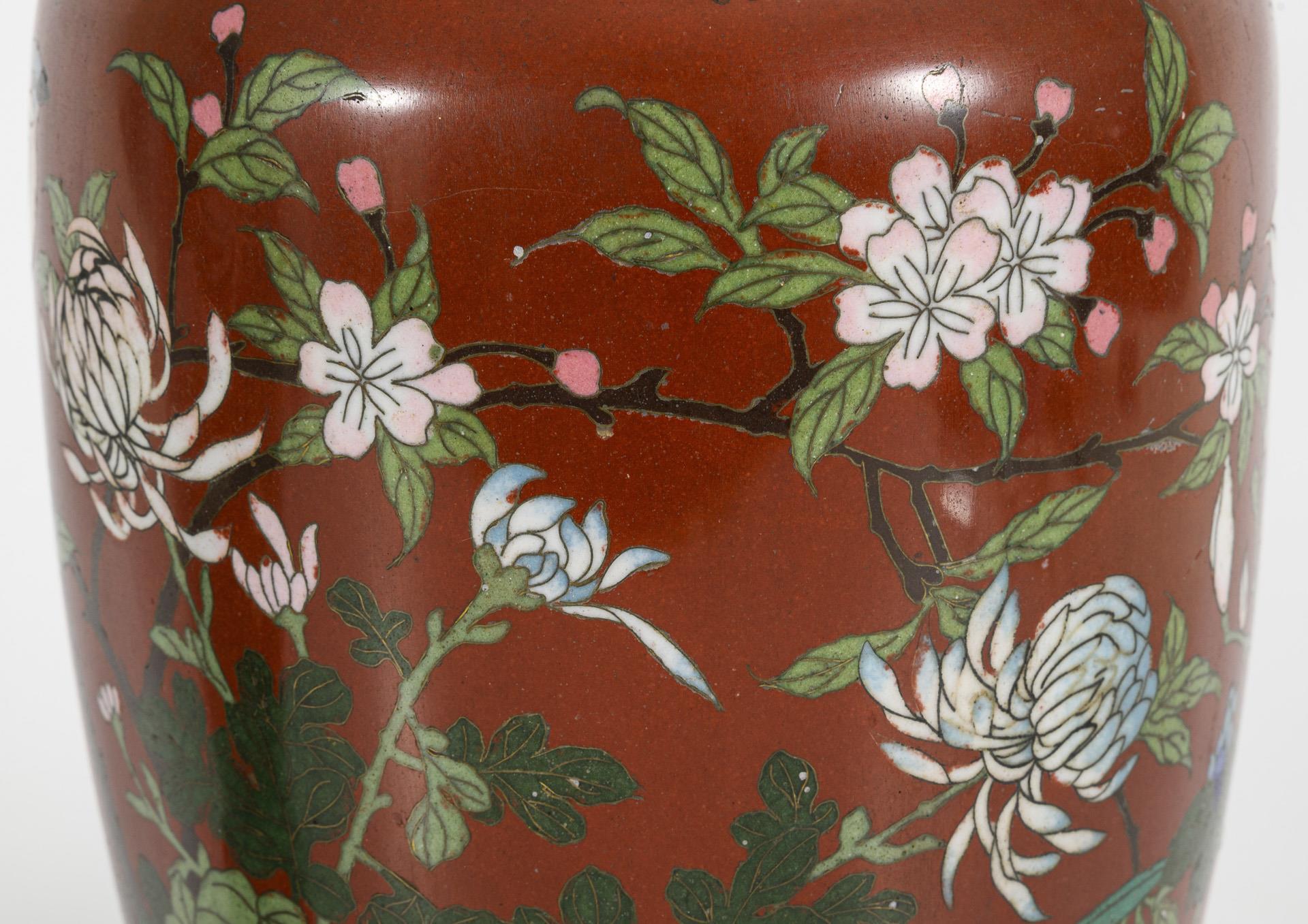 Birds among flowering branches, chrysanthemums, peonies and bindweed, on a brown ground. Metal mount as foot and border with recessed insert. Metal somewhat tarnished.