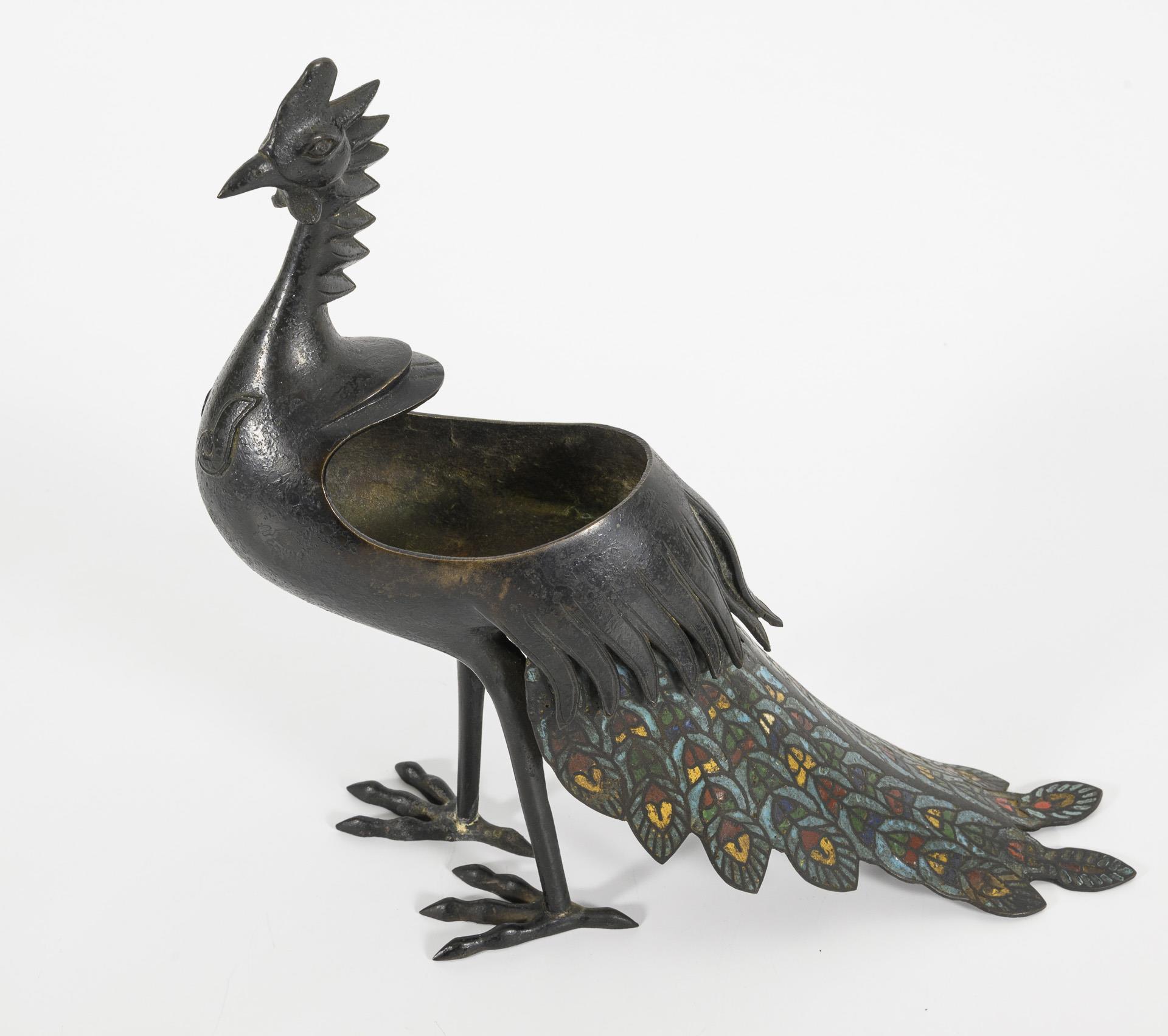 Bronze peacock with long tail feathers in champlevé technique, the body shaped as a bowl, the tail is movable. H 30 cm, L 31 cm. / Smaller bird on a wooden base, the surface with thread overlay, the feathers on the back shaped as a lid in cloisonné technique. H 19.5 cm, L 28 cm.