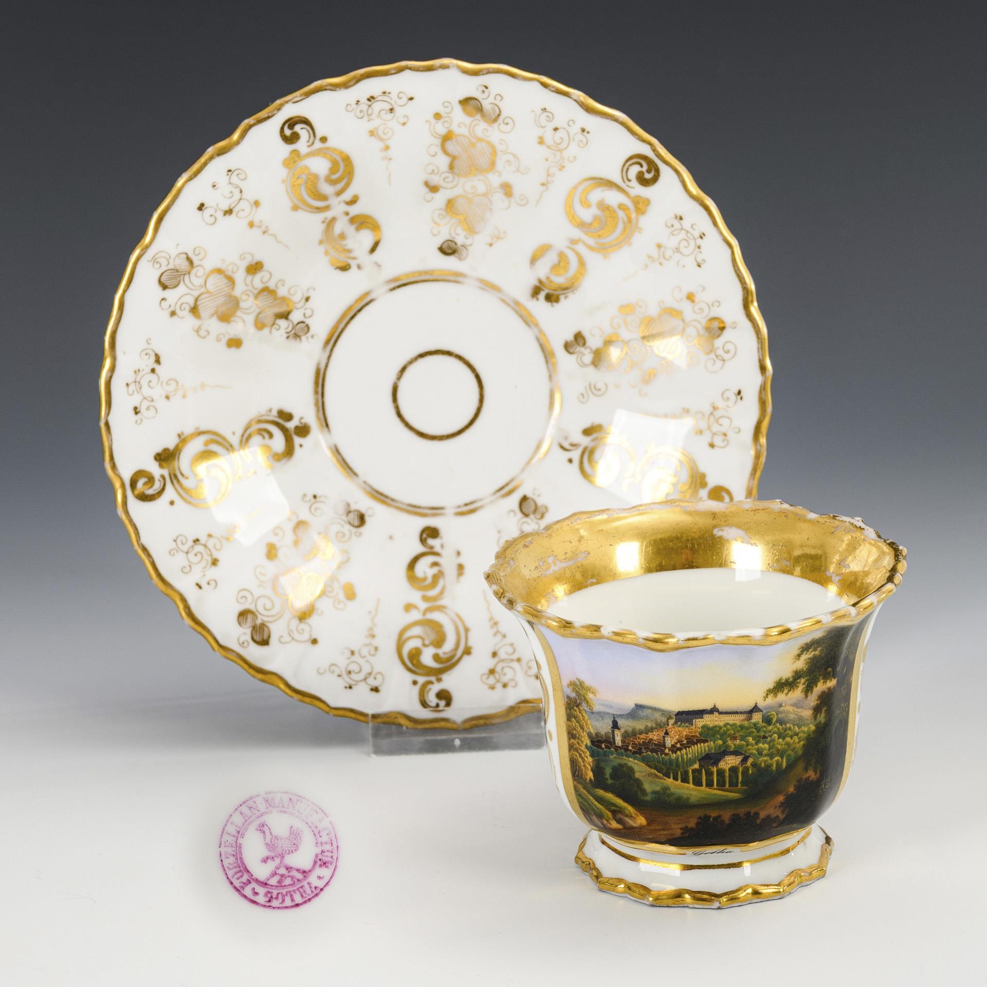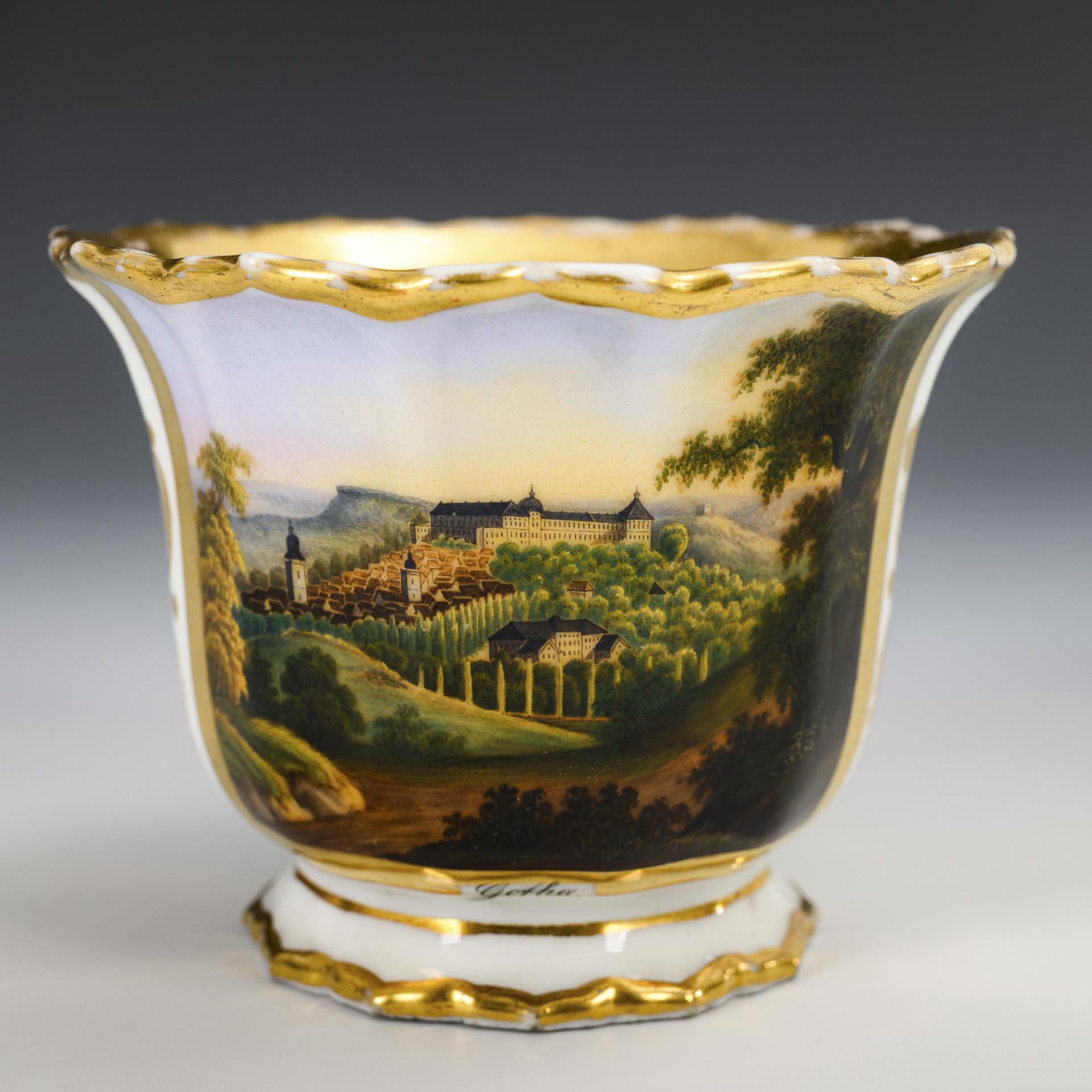 Footed, polygonal bell-shaped cup with ear-shaped handle. On the front a gold-framed rectangular cartouche with the inscribed view of the city of Gotha with a view of Friedenstein Castle, verso vegetal gold painting. Gold somewhat rubbed.