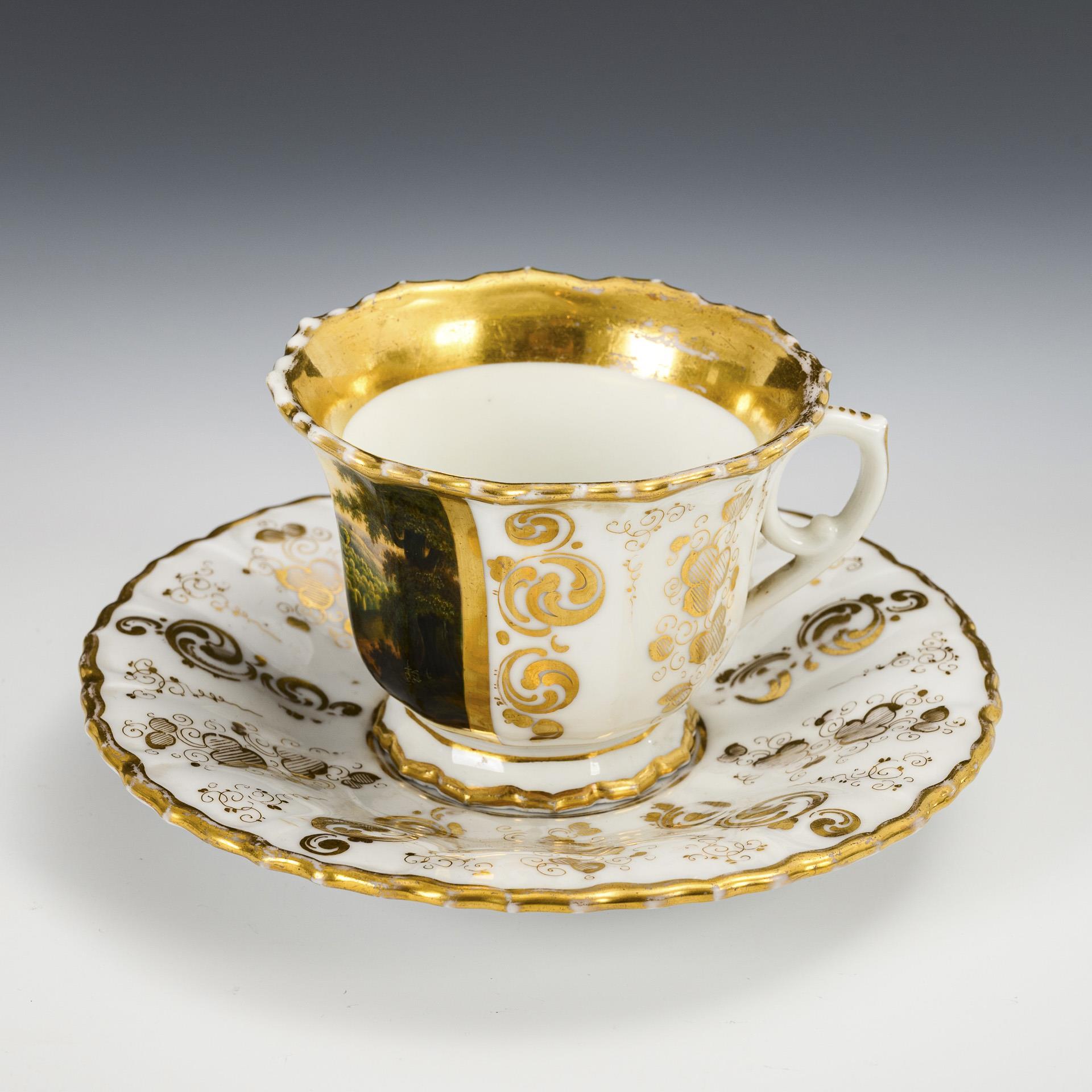 Polychrome painted, decorated in gold. Cup (h 7 cm), original saucer (Ø 16 cm). 370 g.