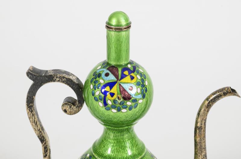 Silver body decorated with green translucent enamel. Handle and slender spout made of visible silver. Lid sluggish, three smaller chips on one side.