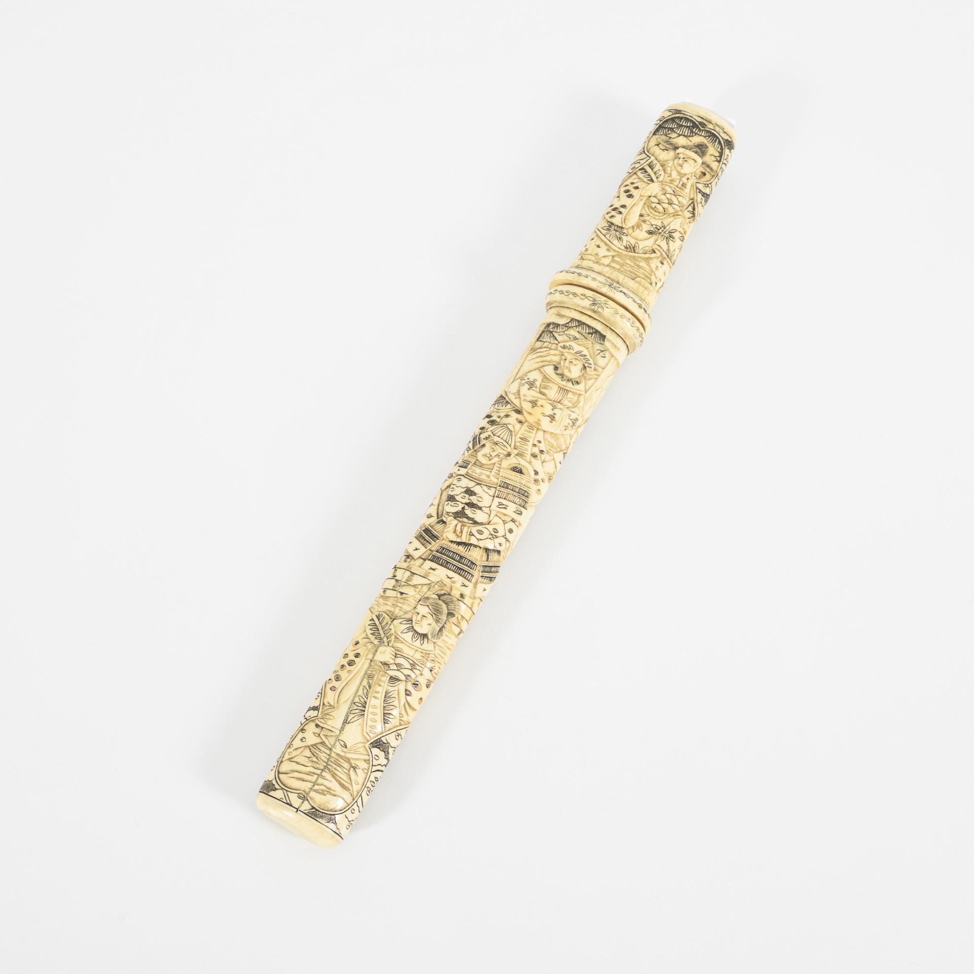 Sheath and grip of bone, with figural scenes in relief, partly patterned in black. Simple, straight blade with a point in the back. Scabbard hollow, with inserted wooden receptacle.