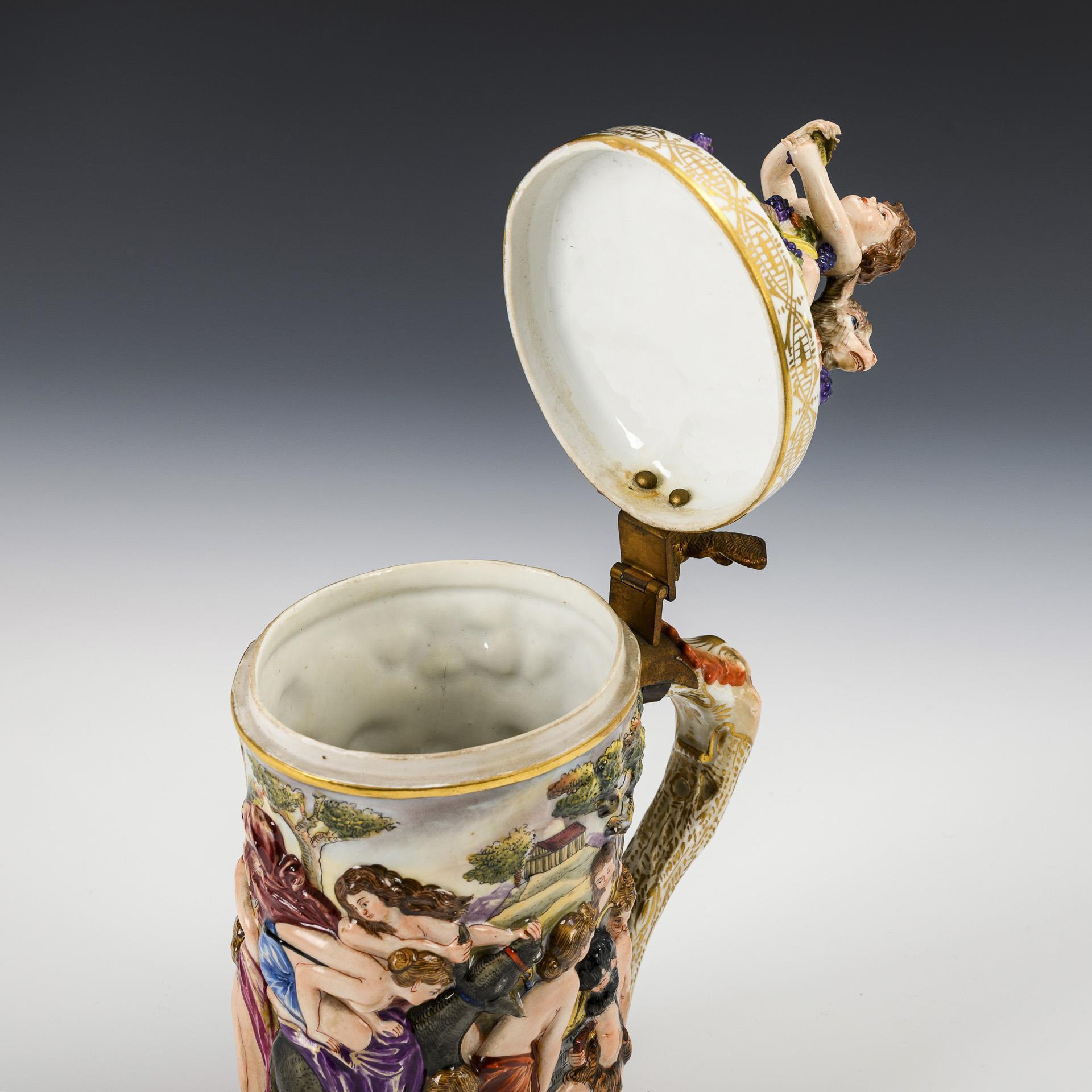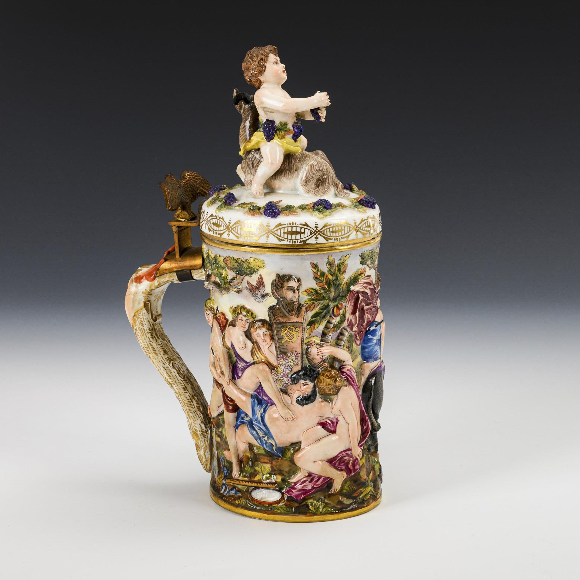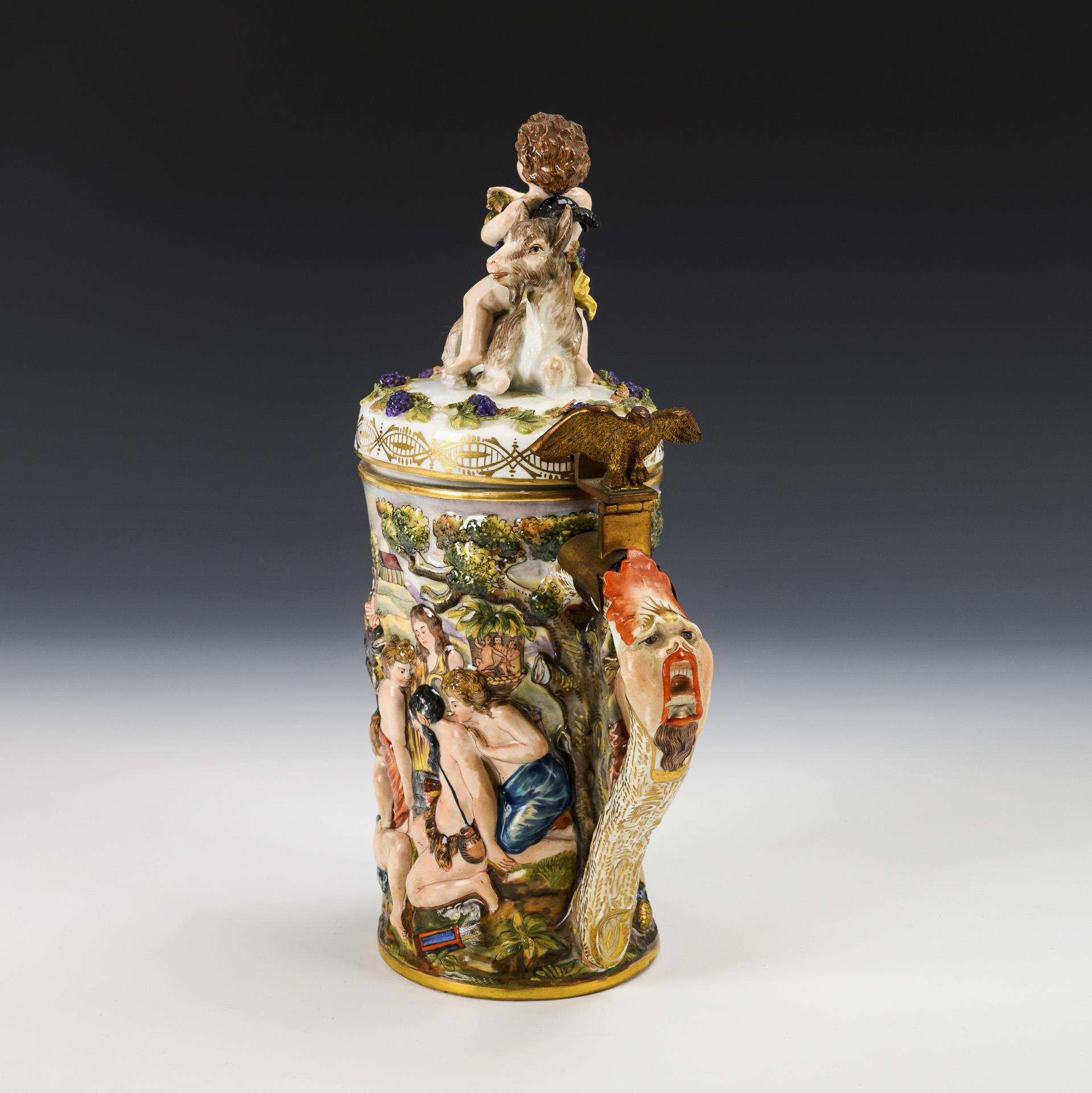 Cylindrical jug with a multi-figure Bacchante relief, mascaron handle and hinged lid with a Bacchante boy on a billy goat. 1 goat's horn chipped.