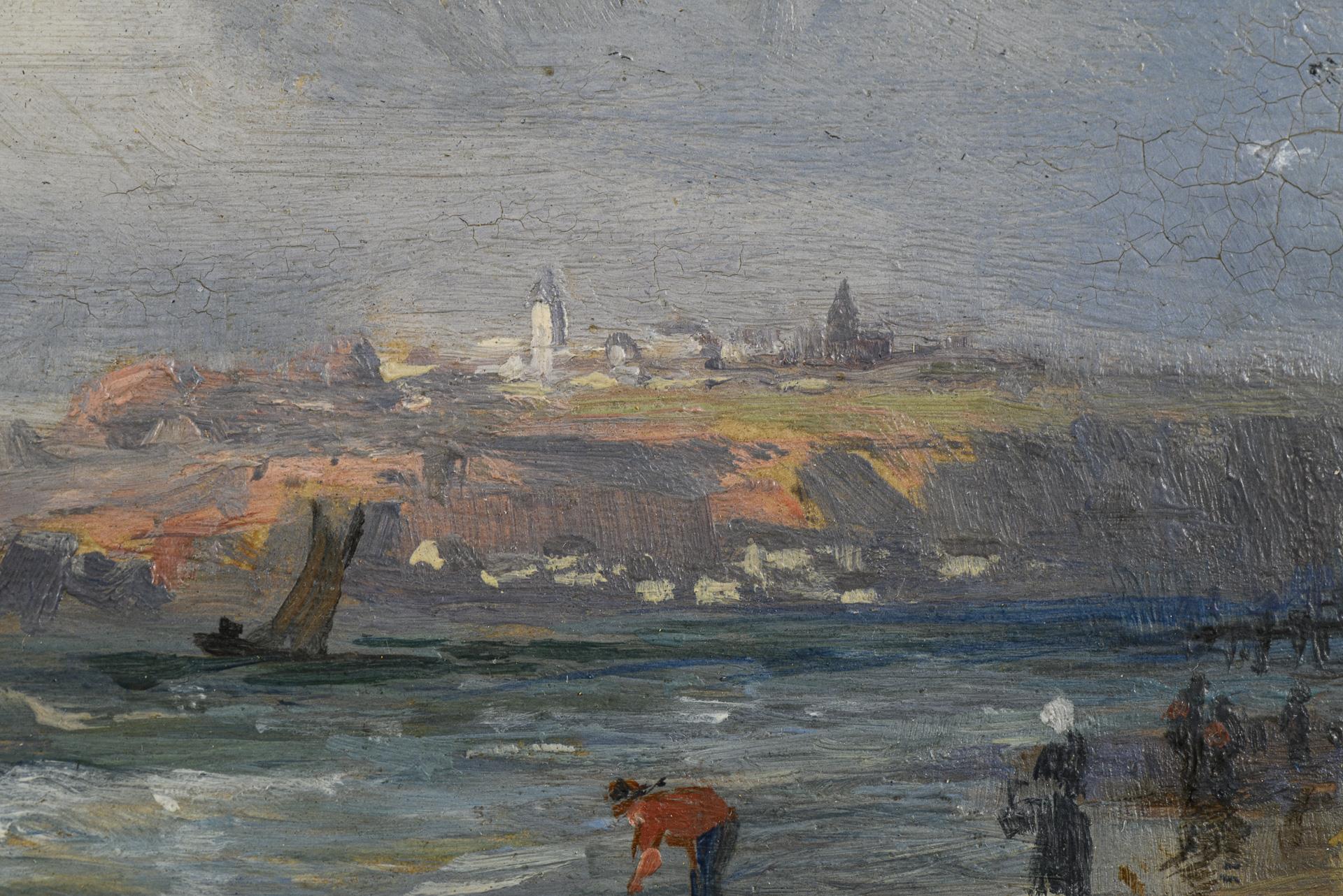Beach view with sailors and staffage figures in stormy weather with a view of an island. Minimal traces of age.