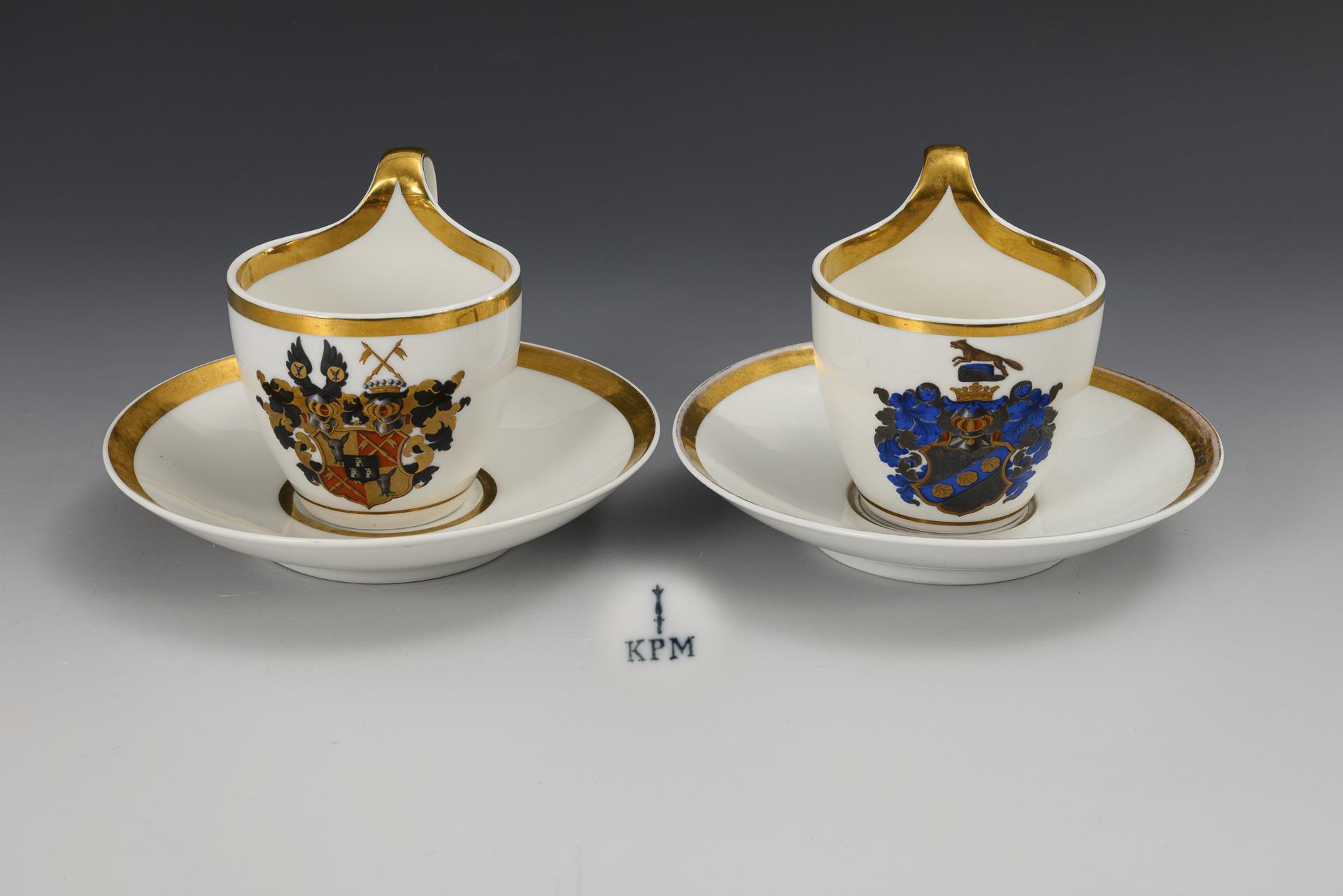 Large campanile cups with coat of arms on the front. 1x with the coat of arms of the von Riedesel family of Eisenbach, inscribed "V. v. Riedesel seinem A. v. Braunbehrens" in the mirror of the saucer. / 1x with the coat of arms of the von Vietinghoff family, inscribed "E. v. Vangerow seinem A. v. Braunbehrens". Partial gold abrasion, 1x hairline crack in the handle.