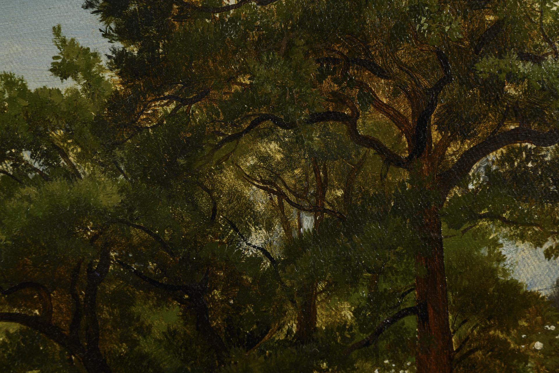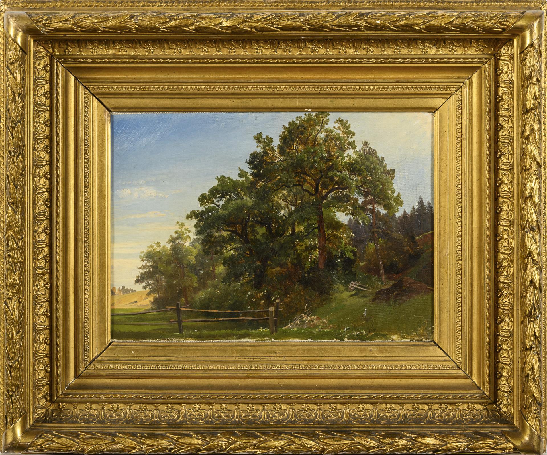 Probably unsigned oil study by the painter with groups of trees near the edge of the forest on a meadow slope under a blue sky. Doubled canvas.