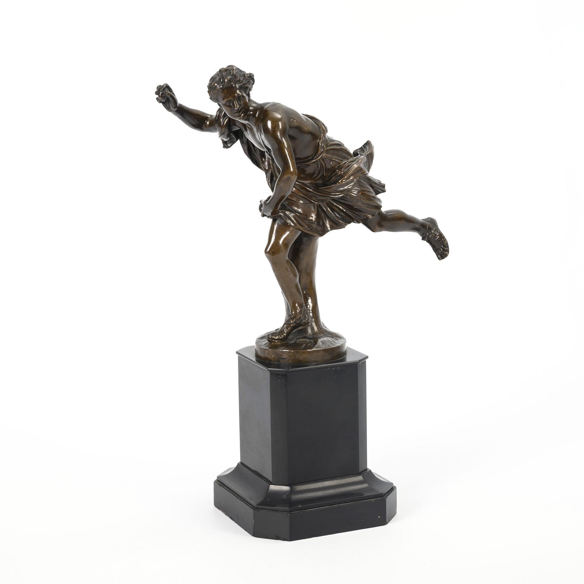 Exceptionally strong moving figure in full run according to ancient mythology: The hero Hippomenes (according to another version Meilanion) fell in love with the Amazonian huntress Atalante, who had sworn perpetual virginity. As the fastest runner in Greece, she made it a condition that she would only marry the man who could beat her in the race; otherwise he would have to die. Hippomenes receives three golden apples from Venus/Aphrodite, which he is about to drop. As Atalante bends down after them, he is able to win the race and her. The original marble figure was created before 1714 and is now in the Louvre. Some chipping on the marble base.