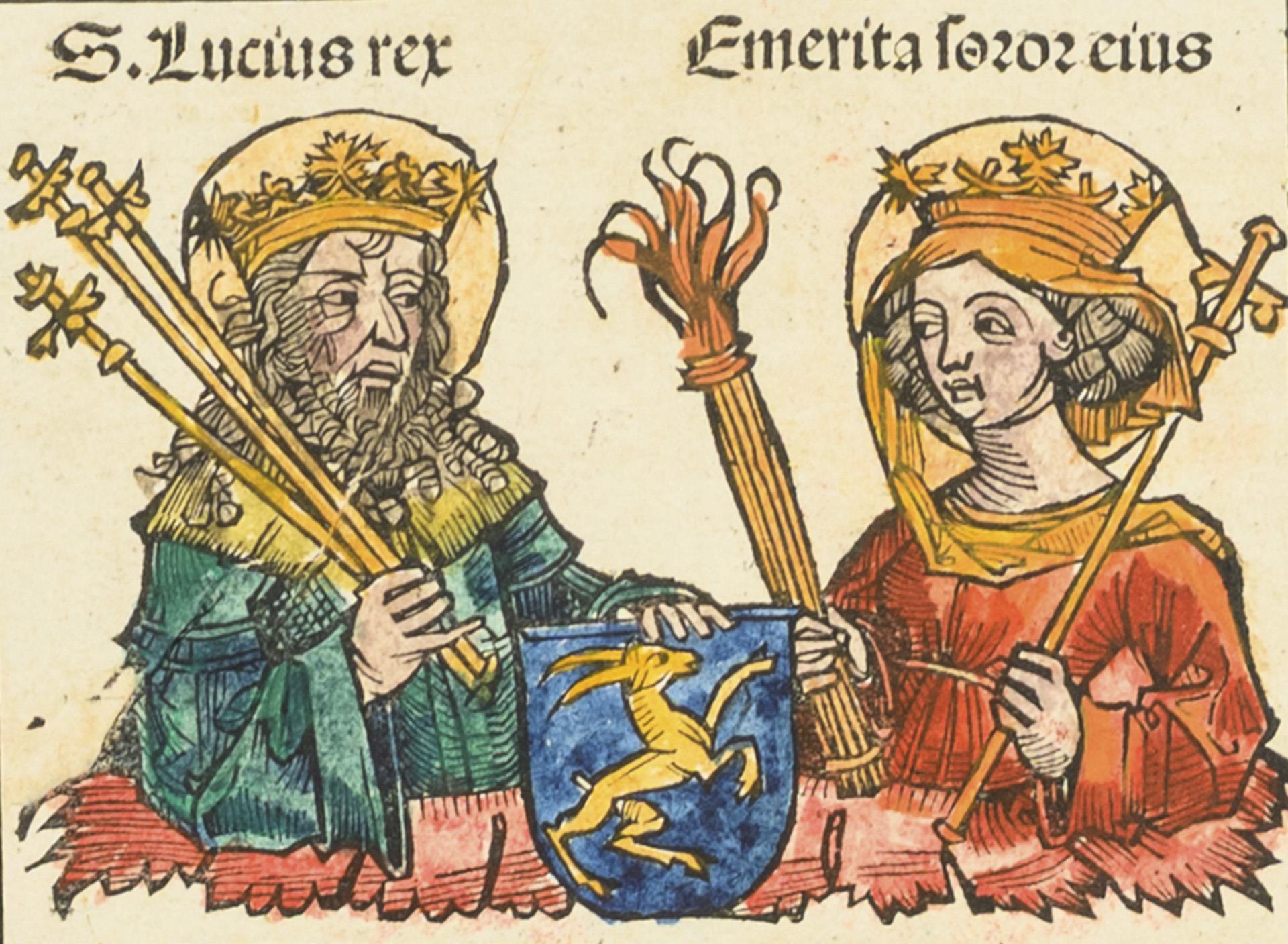 Lucius Coilli and his sister Emerita as saints. With an undated certificate from the Kandel antiquarian bookshop in Lörzweiler near Mainz. Narrowly trimmed, stitched to backing paper, also typography on the reverse.