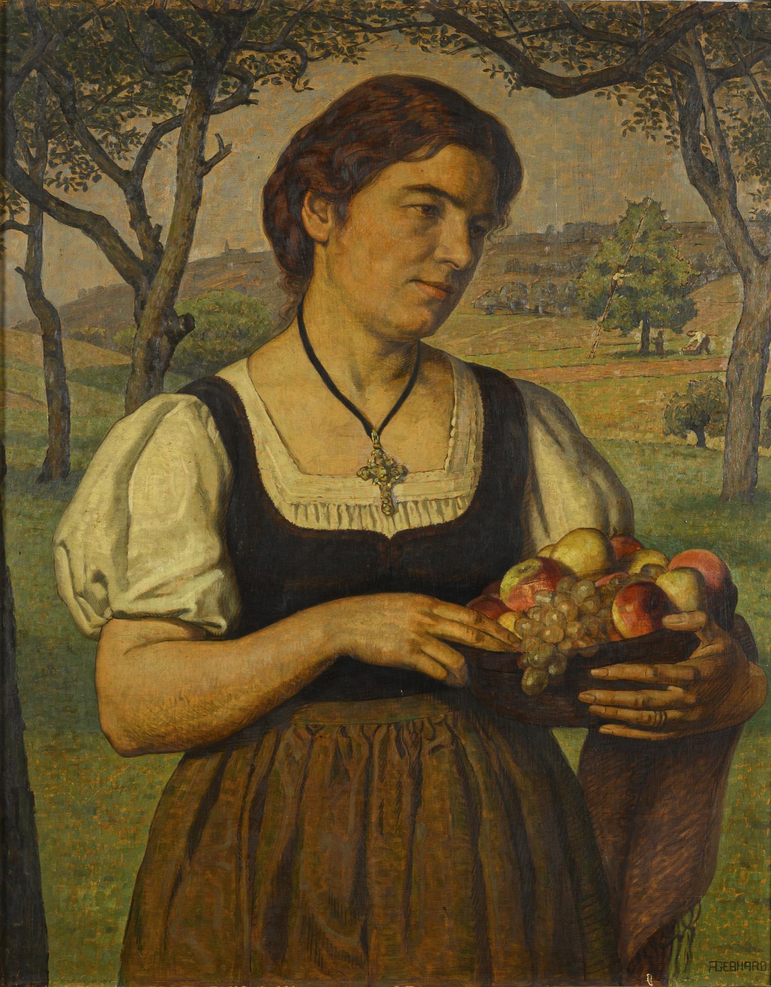 Portrait of a young woman in country dress between fruit trees with a bowl of apples and grapes. Traces of age.