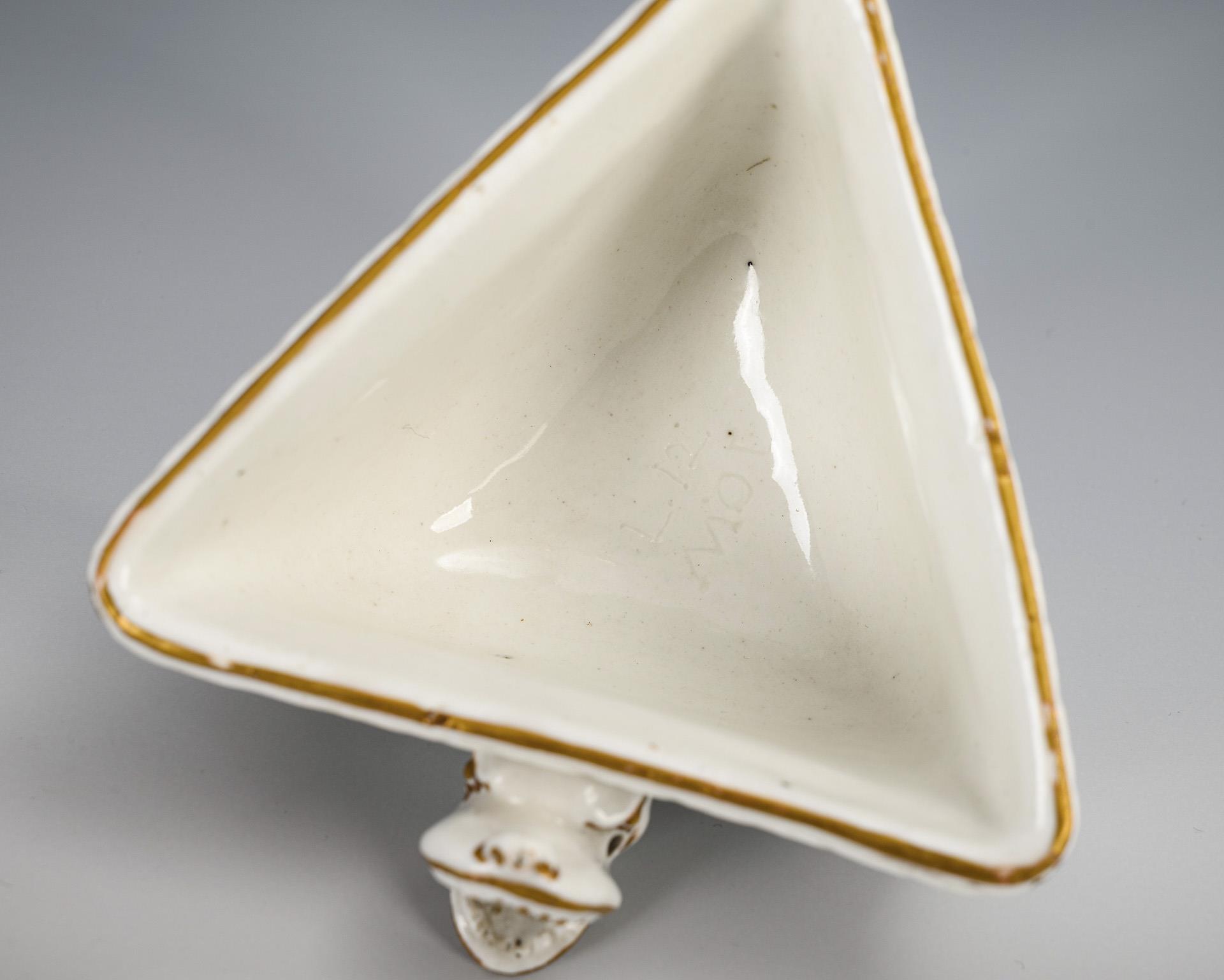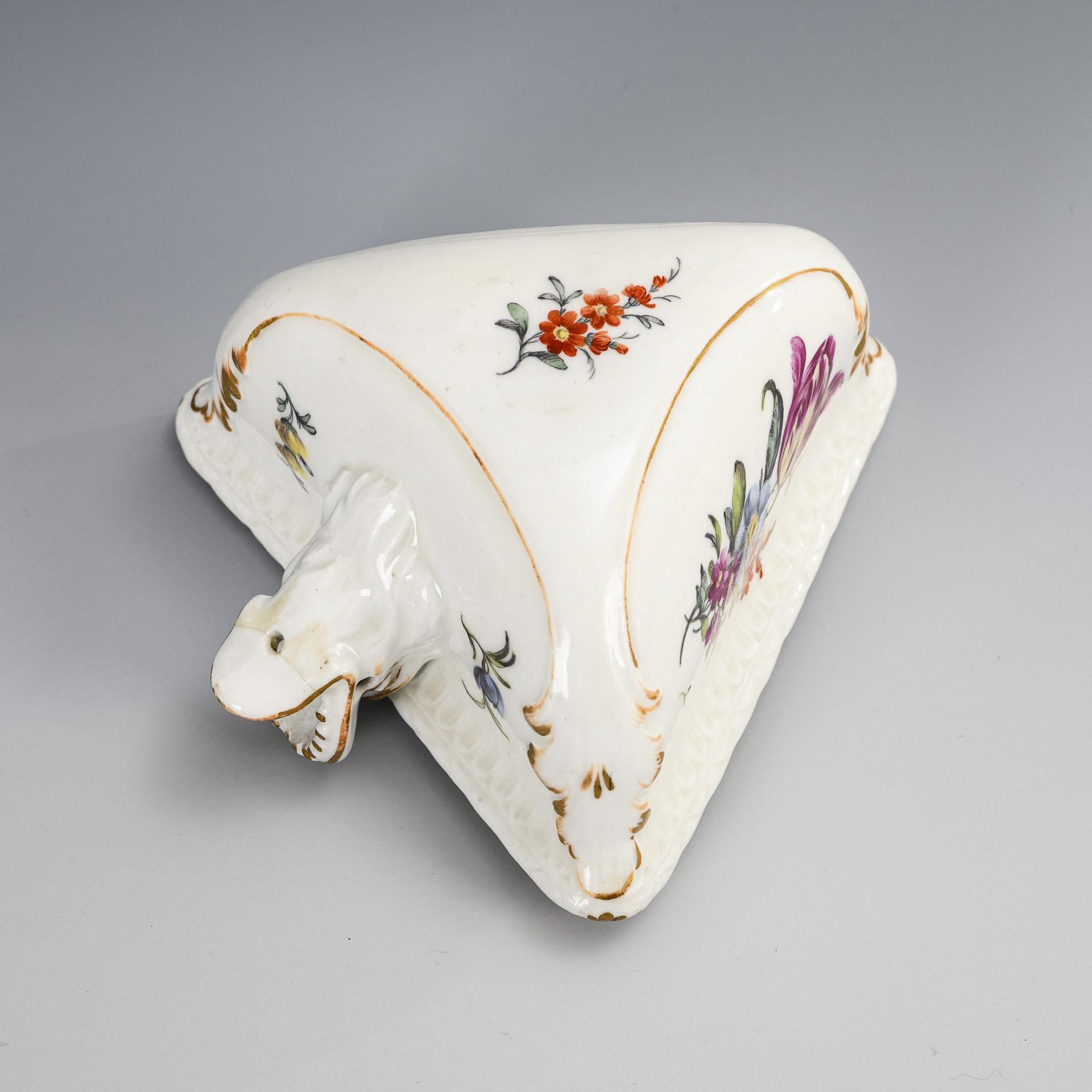 Exceptional triangular scoop part with flower painting and dolphin as handle setting. Lower half of the dolphin mouth glued.
