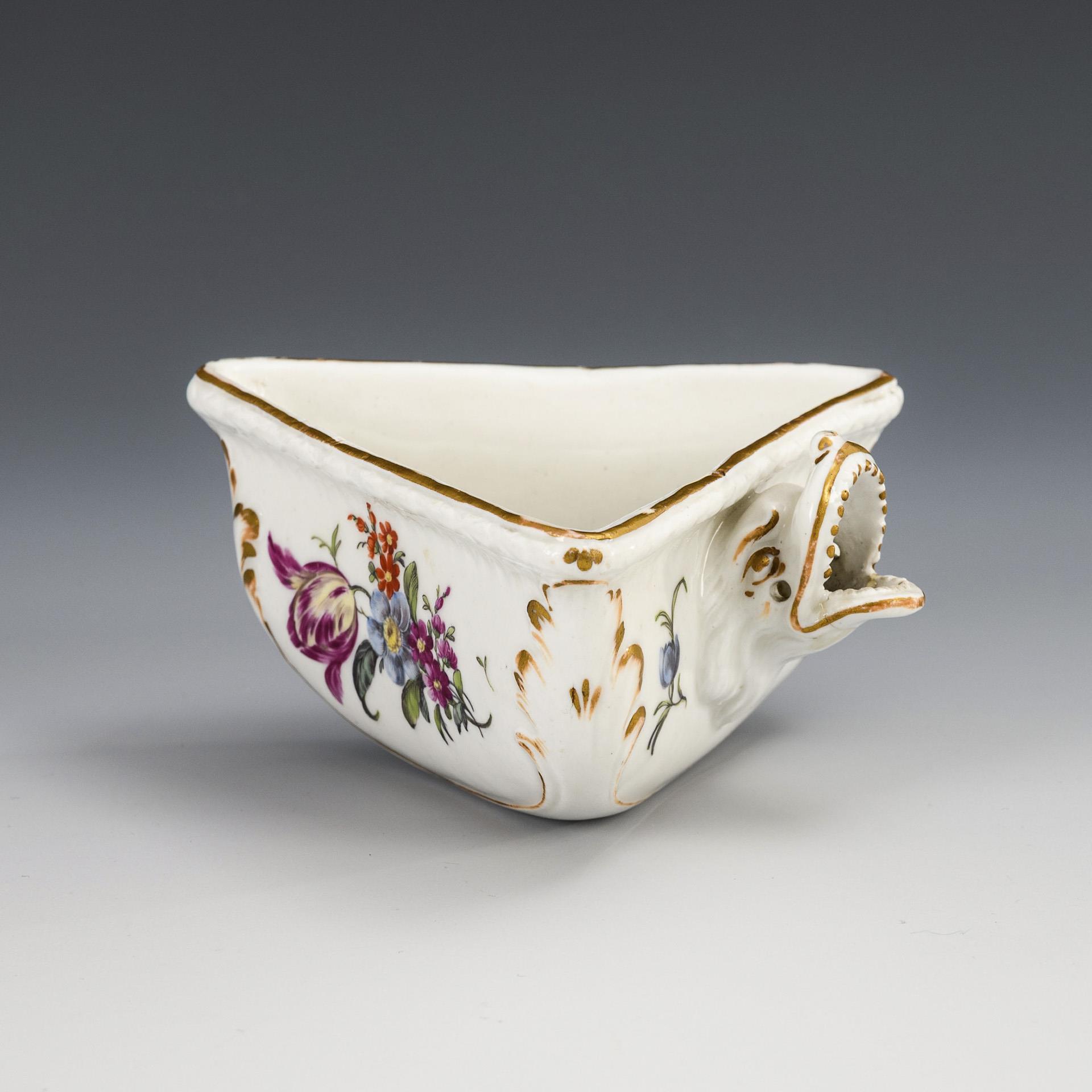 Exceptional triangular scoop part with flower painting and dolphin as handle setting. Lower half of the dolphin mouth glued.