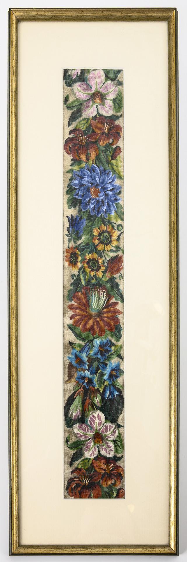 Frieze of various flowers in vibrant colors embroidered with very fine glass beads similar to needle painting. In a glazed passe-partout with gold border.