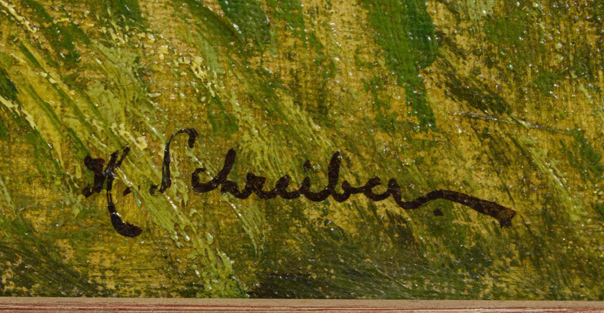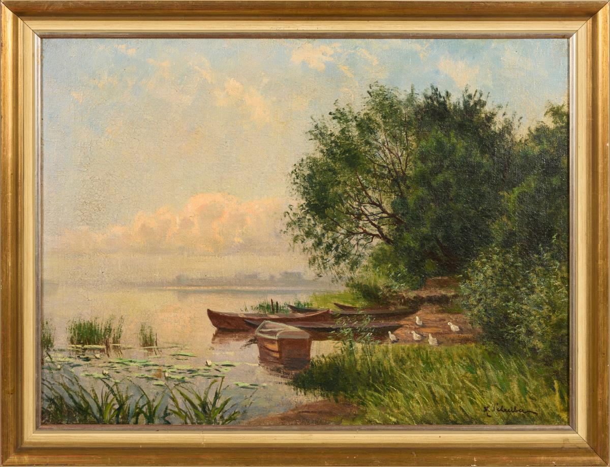 Schreiber, Hermann: Seeufer mit Enten. Öl/Lwd., re. u. sign., um 1900.
