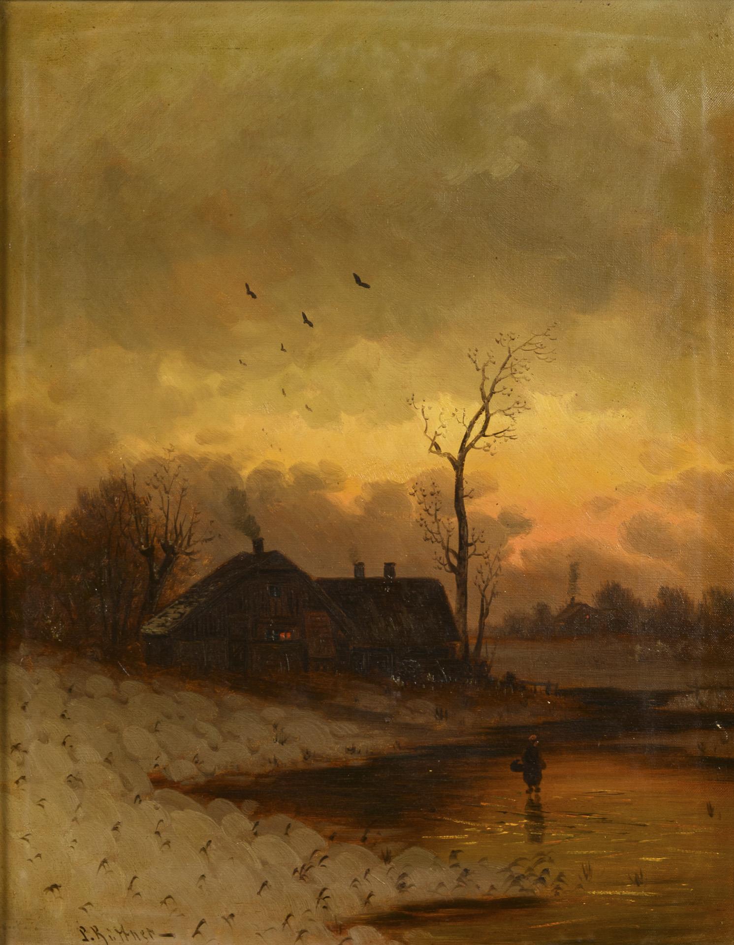 Staffage figure on the frozen river near the farmhouse with the setting sun.