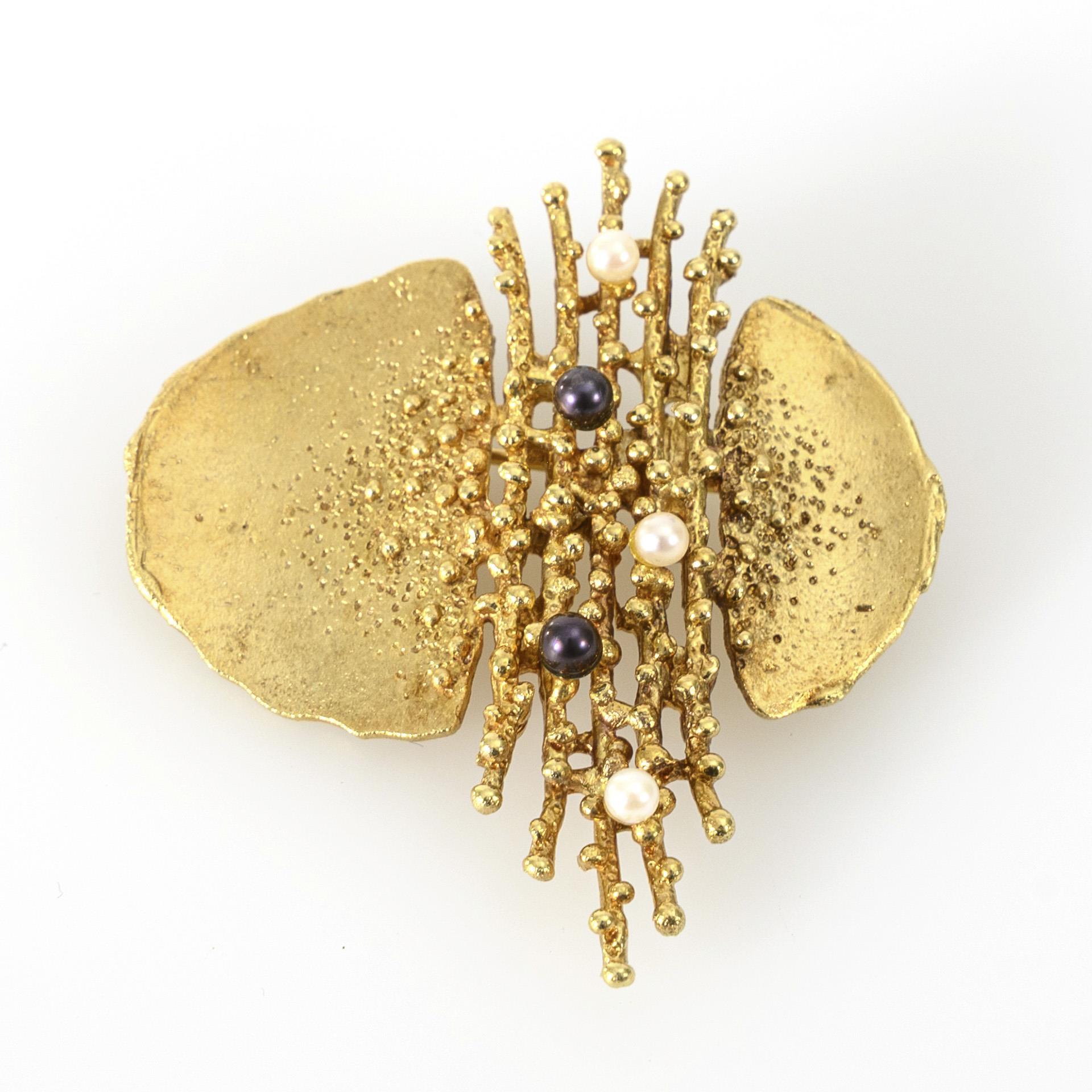 Modern brooch alternatingly set with 3 light and 3 dark pearls, pin with ball hook clasp.