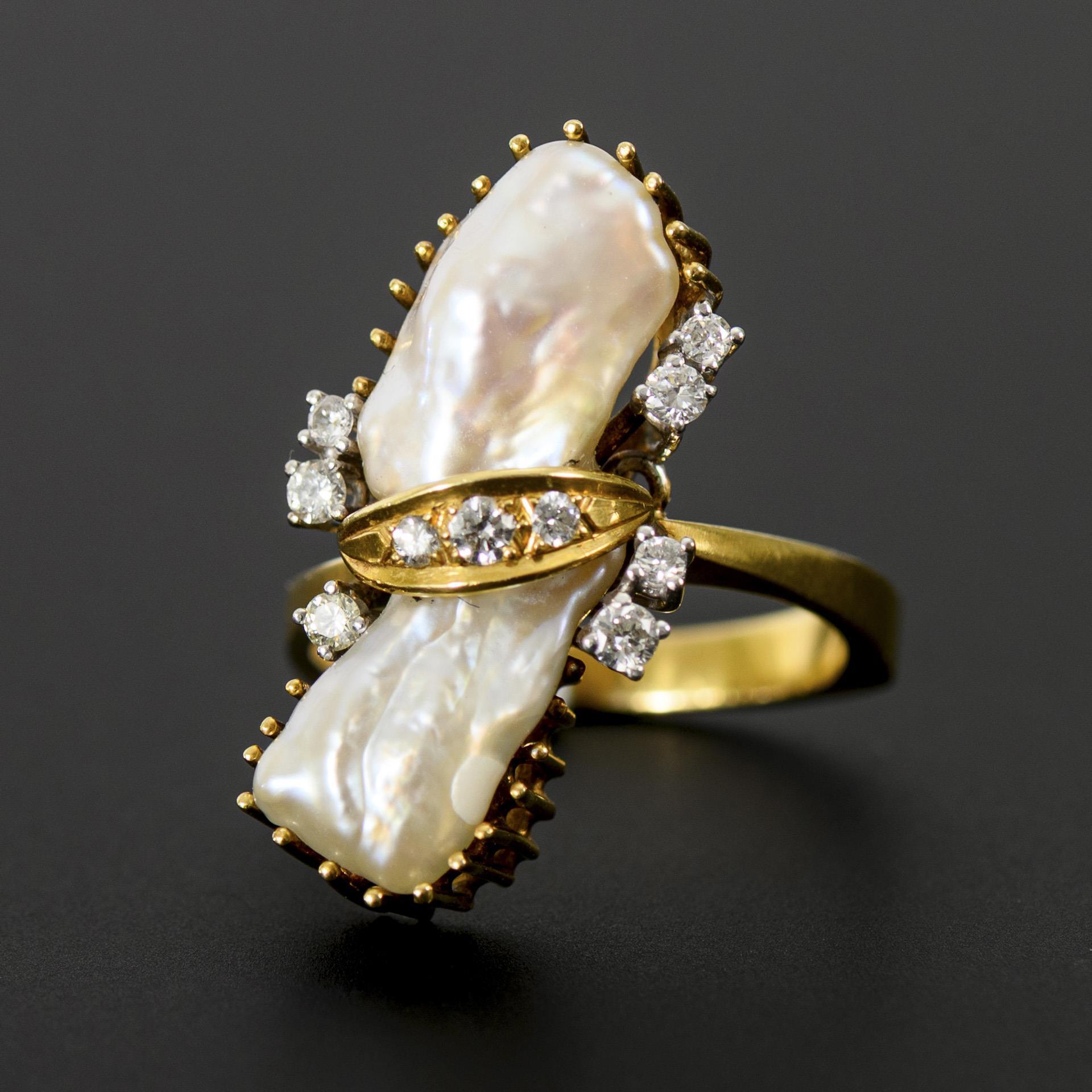 Unusual ring, one-of-a-kind piece with a large baroque pearl and a total of 10 brilliant-cut diamonds.