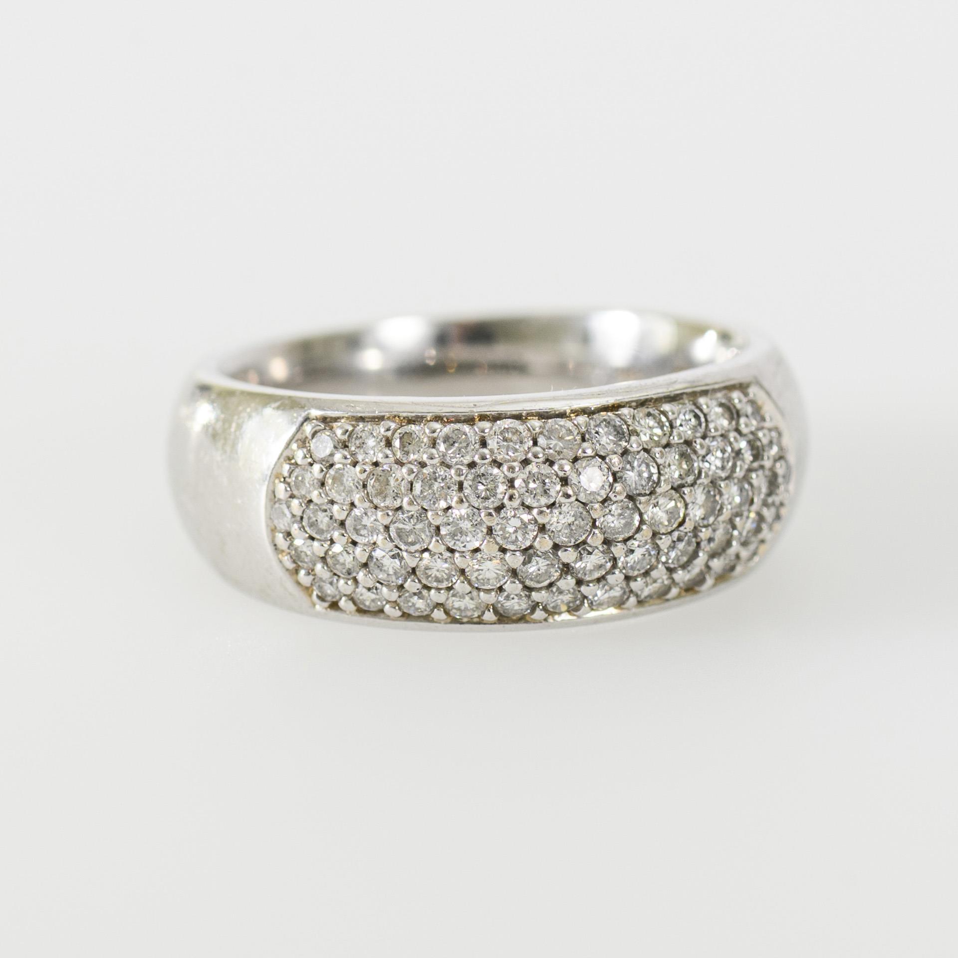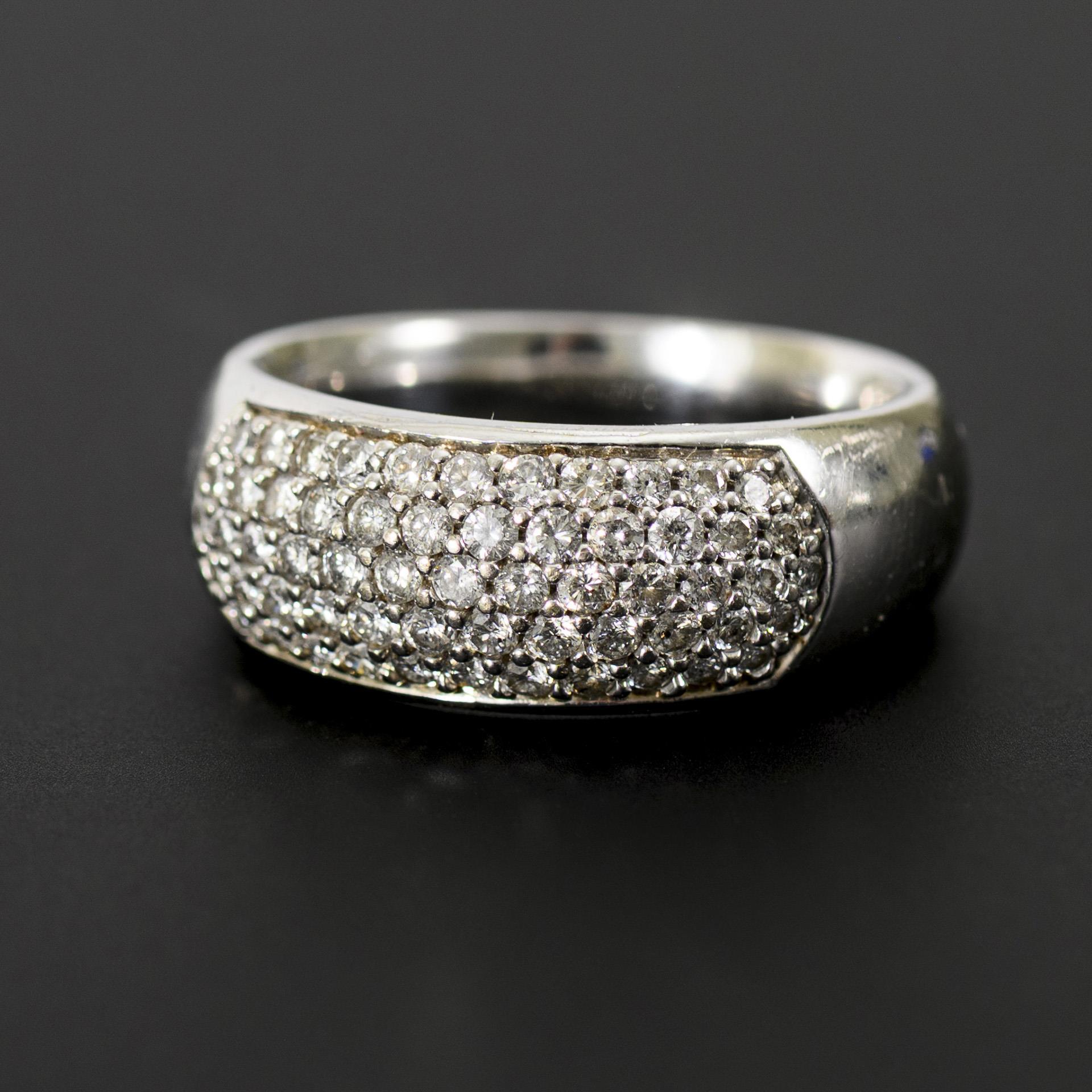Heavy band ring with the front set with small, pavé-set brilliant-cut diamonds. Bottom with signs of wear.