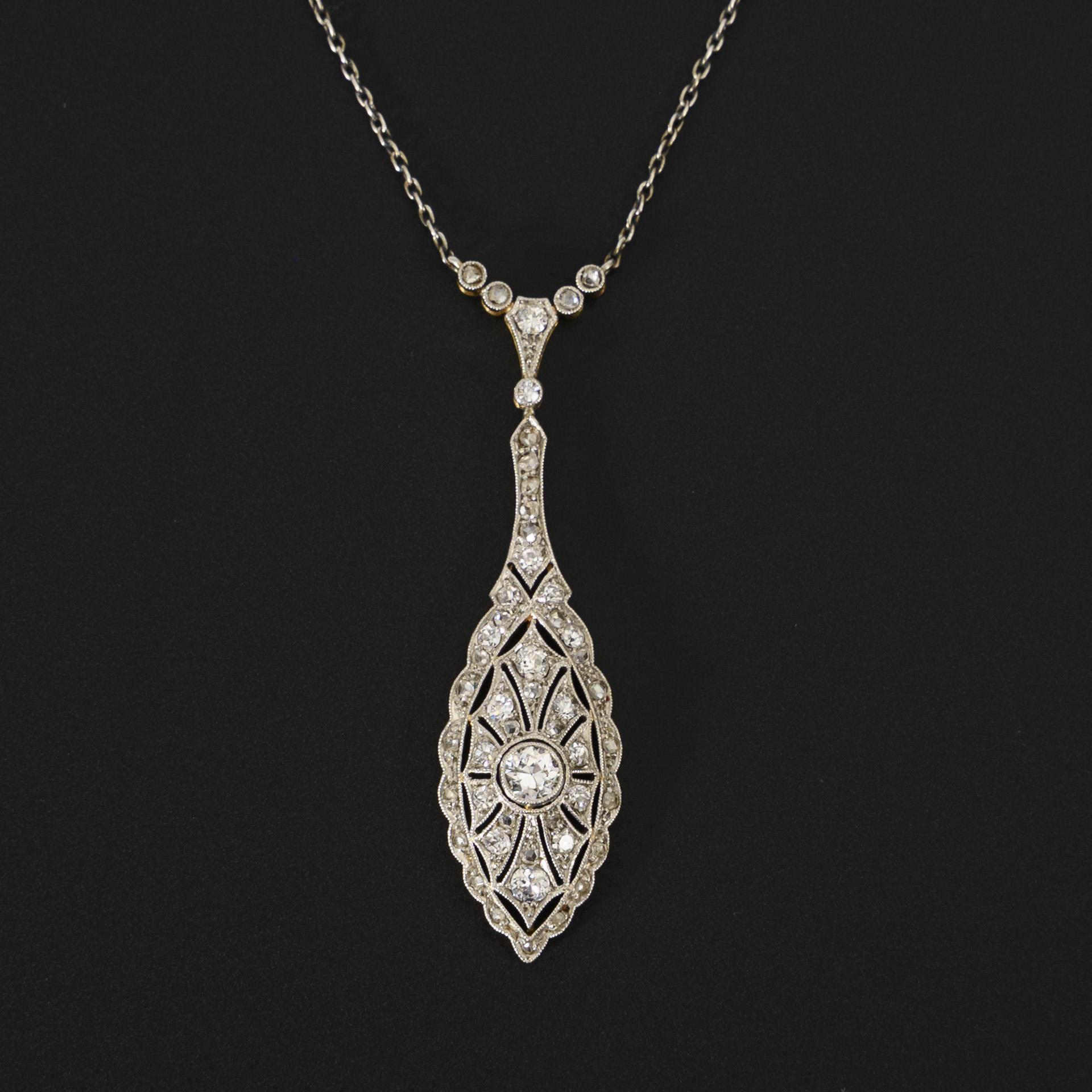 Classic necklace with a rich setting of old-cut diamonds and diamonds in a millegrain setting. The box lock with a figure-of-eight hook for securing.