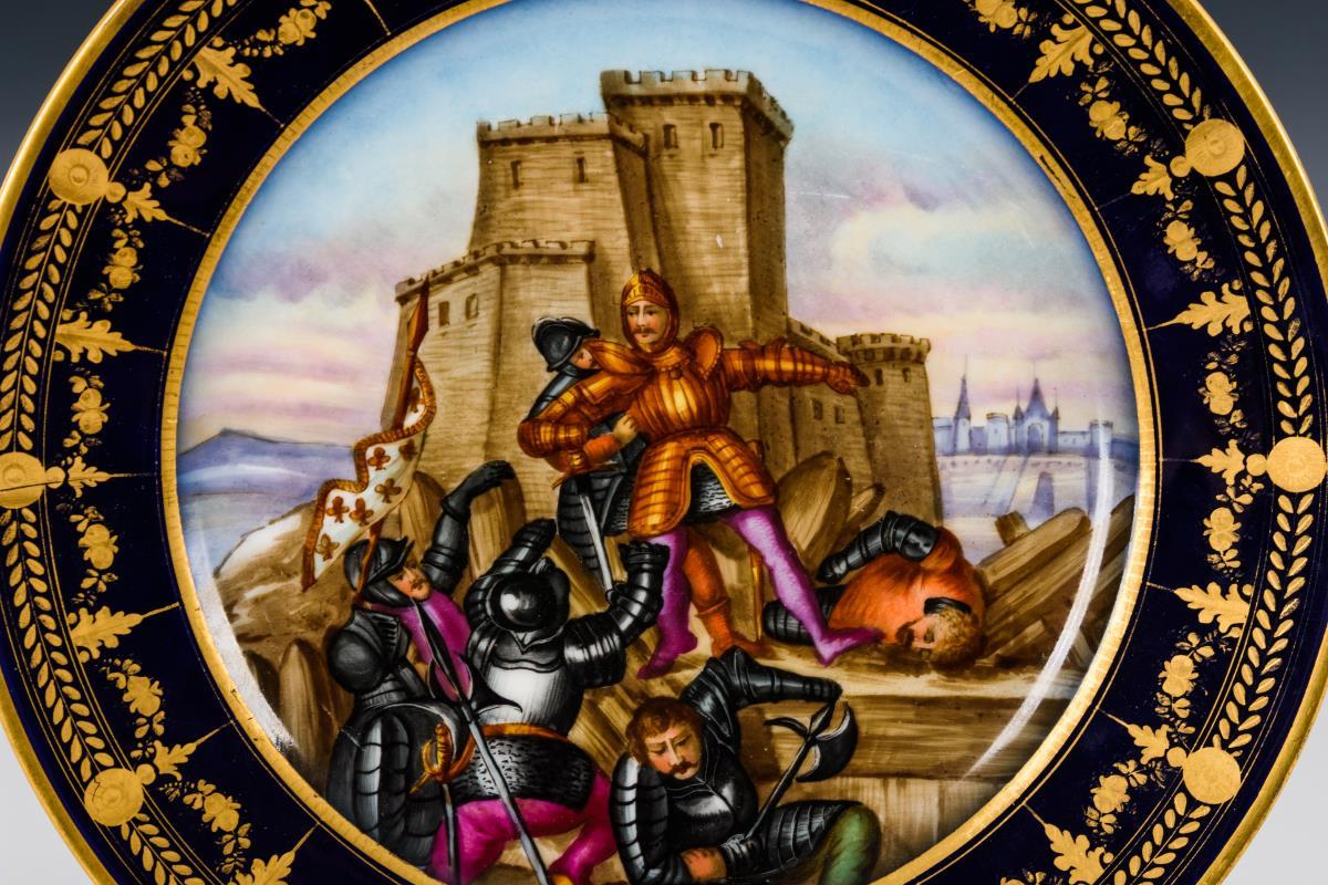 Teller mit floraler, radierter Goldmalerei auf der kobaltblauen Fahne, im Spiegel die Darstellung von kämpfenden Rittern vor einer Burg.
