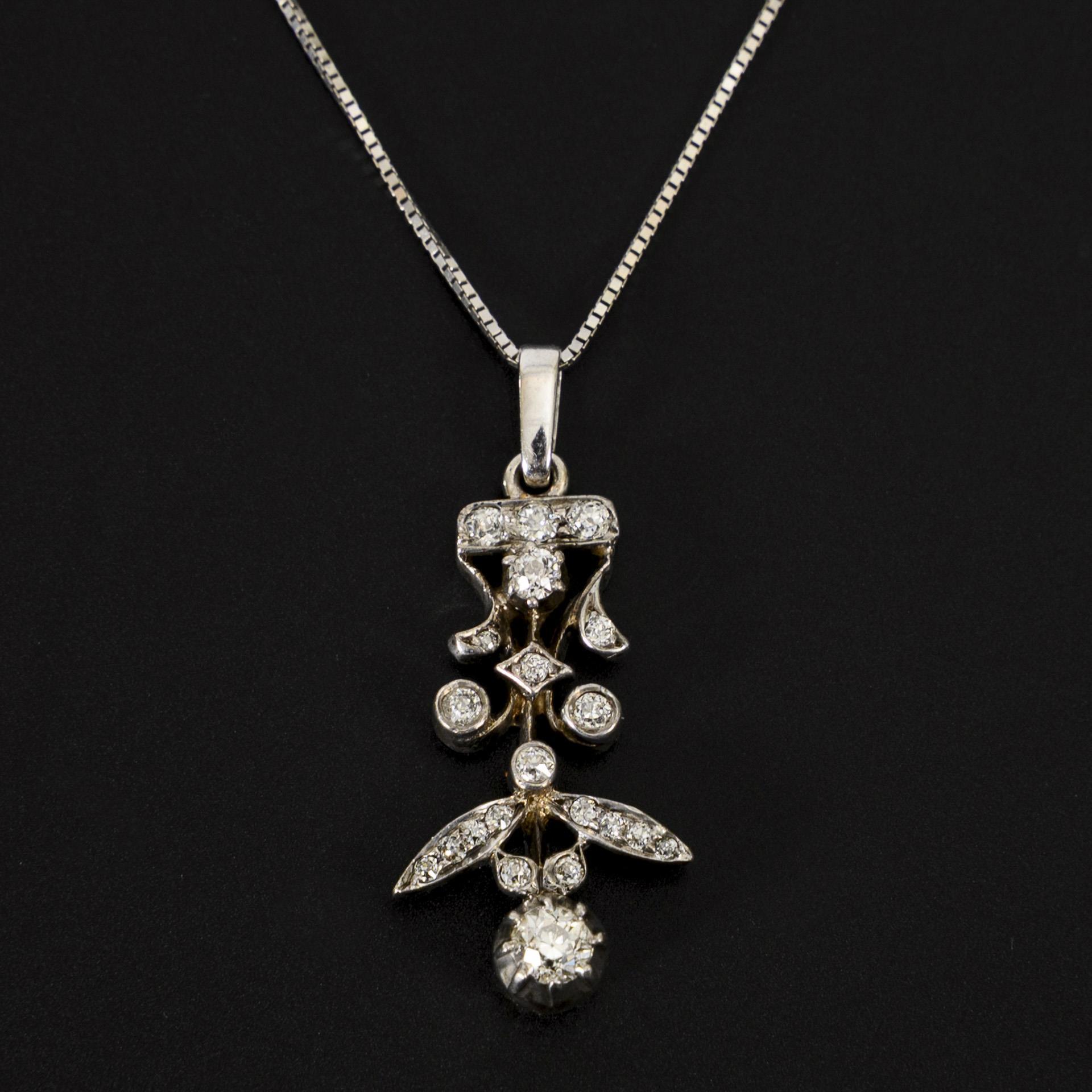 Probably created around 1900 or designed in this style as part of an originally larger piece of jewelry set with old cut diamonds on a pendant eyelet and modern Venetian chain. Chain and pendant eyelet probably supplemented.