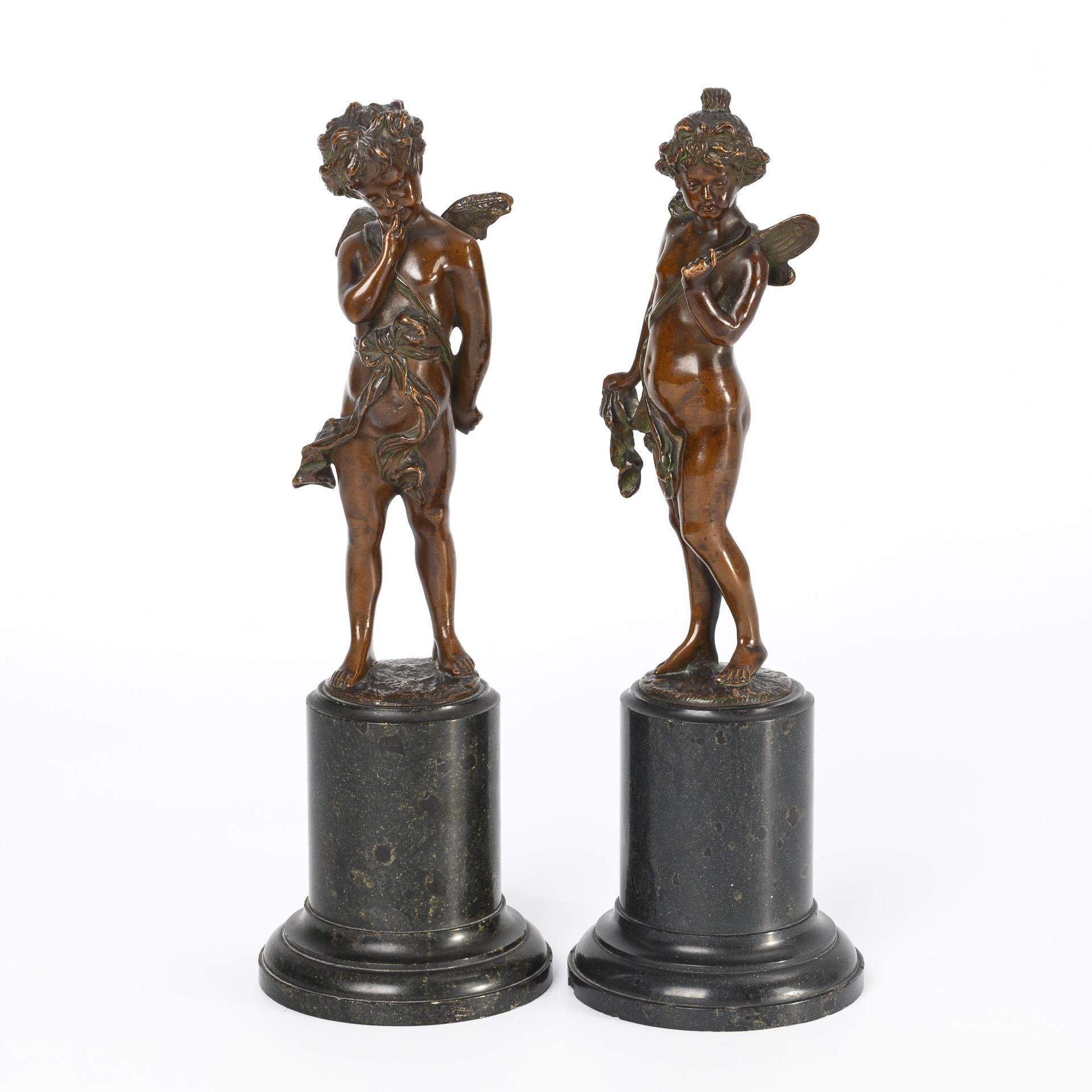 Coquettish and coyly standing cupids. Patina rubbed on each, some scratches on each. Chips to the serpentine.