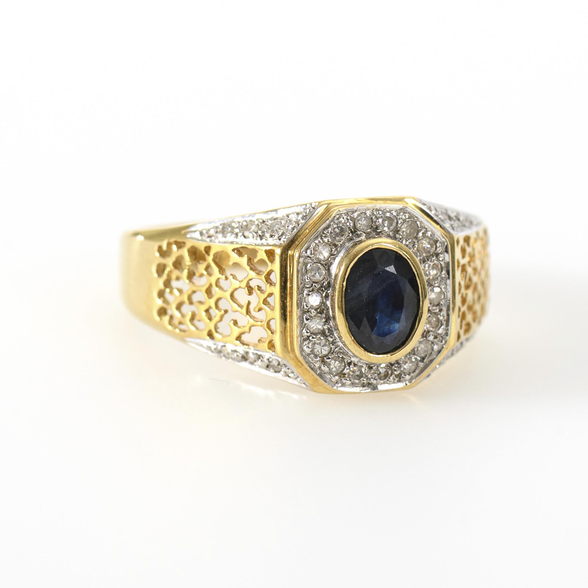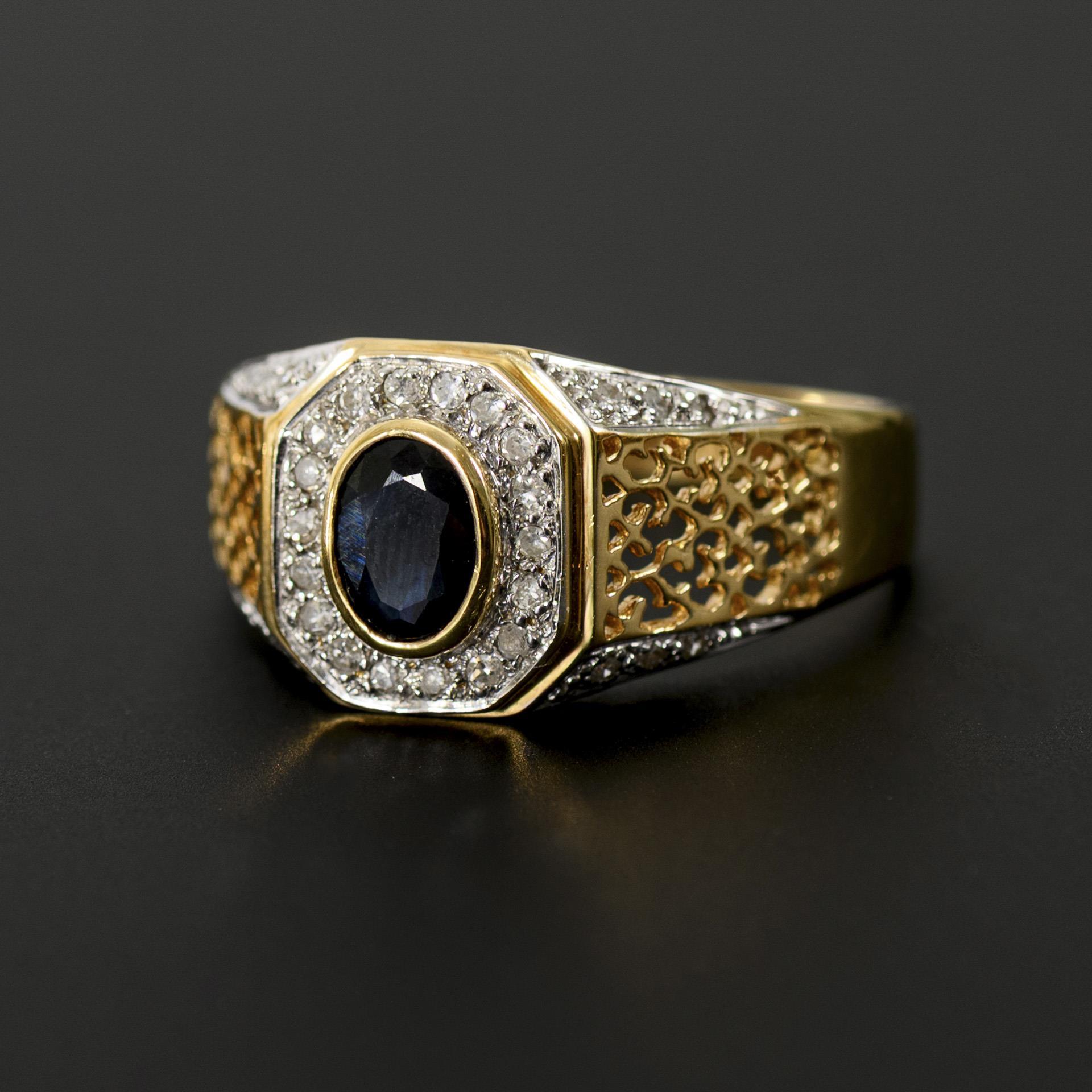 Large ring with a blue colored stone, probably sapphire, and brilliant-cut diamonds.