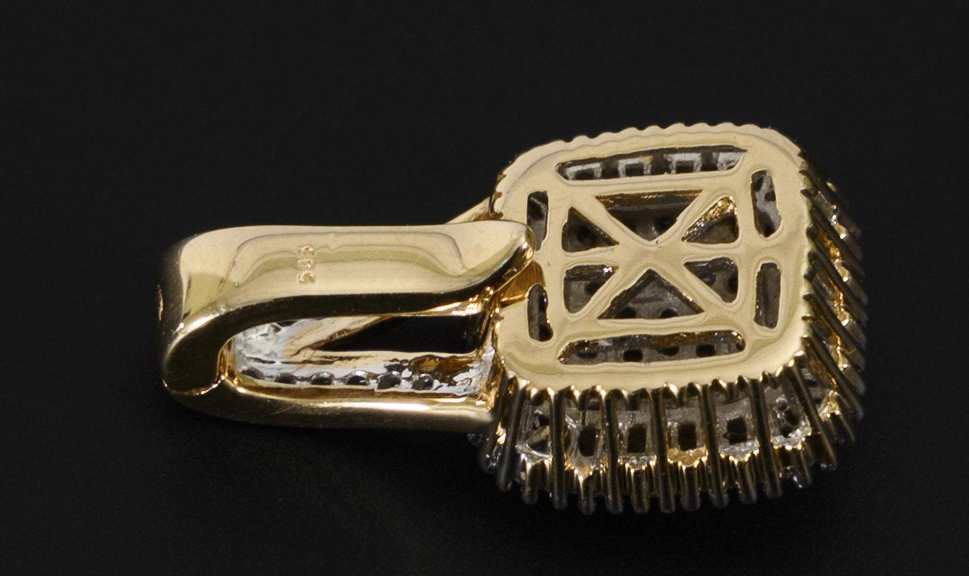 Rectangular clip pendant, surrounded by baguette-cut diamonds and with a slightly stepped setting of pavé-set brilliant-cut diamonds in the center. The double-loop eyelet also set with small pavé-set brilliant-cut diamonds.