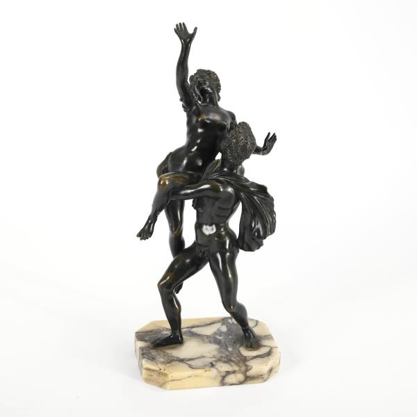 The famous dramatic group of the female robbery here after the version in the Museo di Capodimonte in Naples. The bearded Roman with a flowing cloak over his shoulder lifts the young Sabine woman into the air. The man's legs with hairline cracks, 1 of the woman's arms soldered, casting defects visibly reworked by the foundry, patina rubbed.