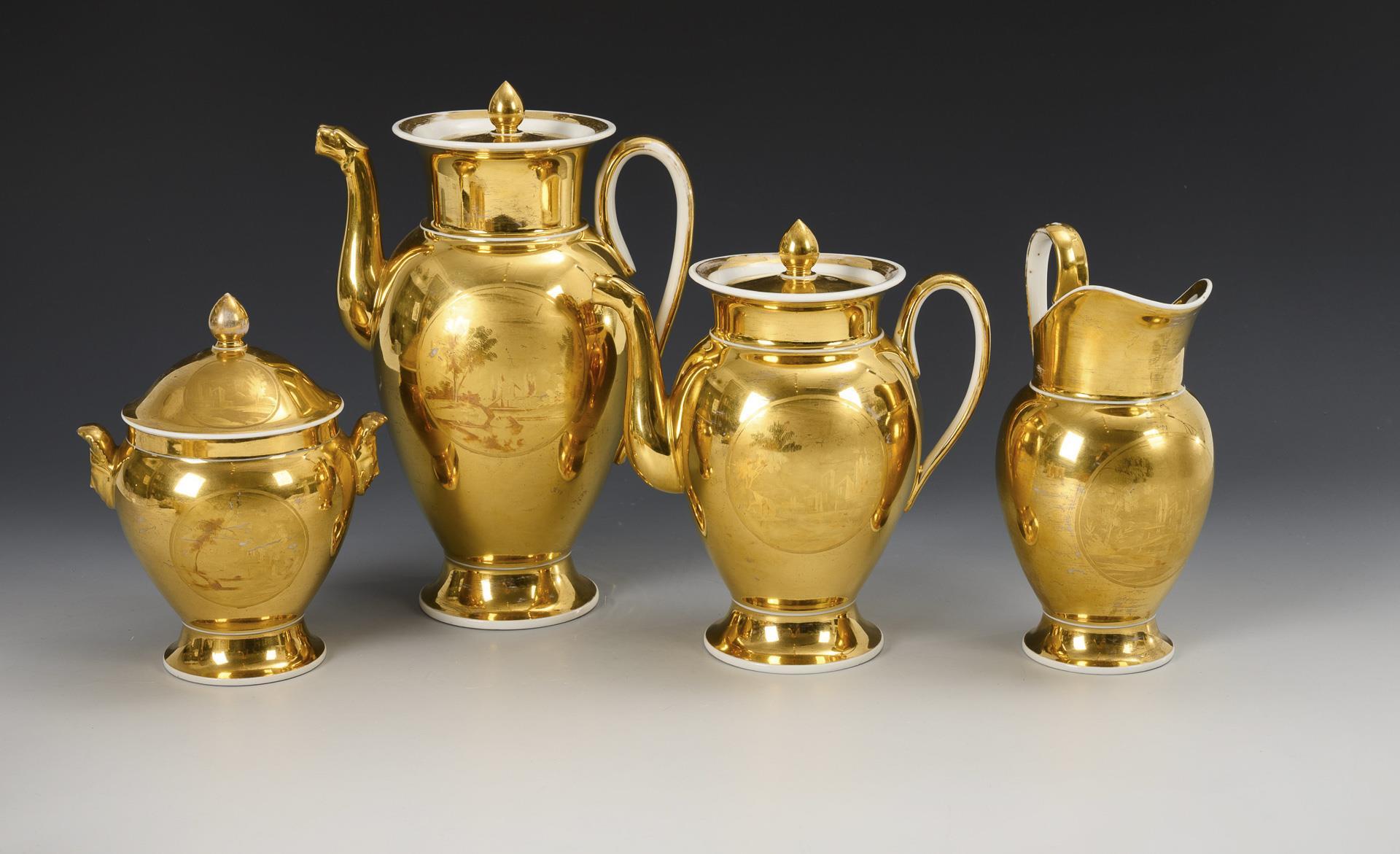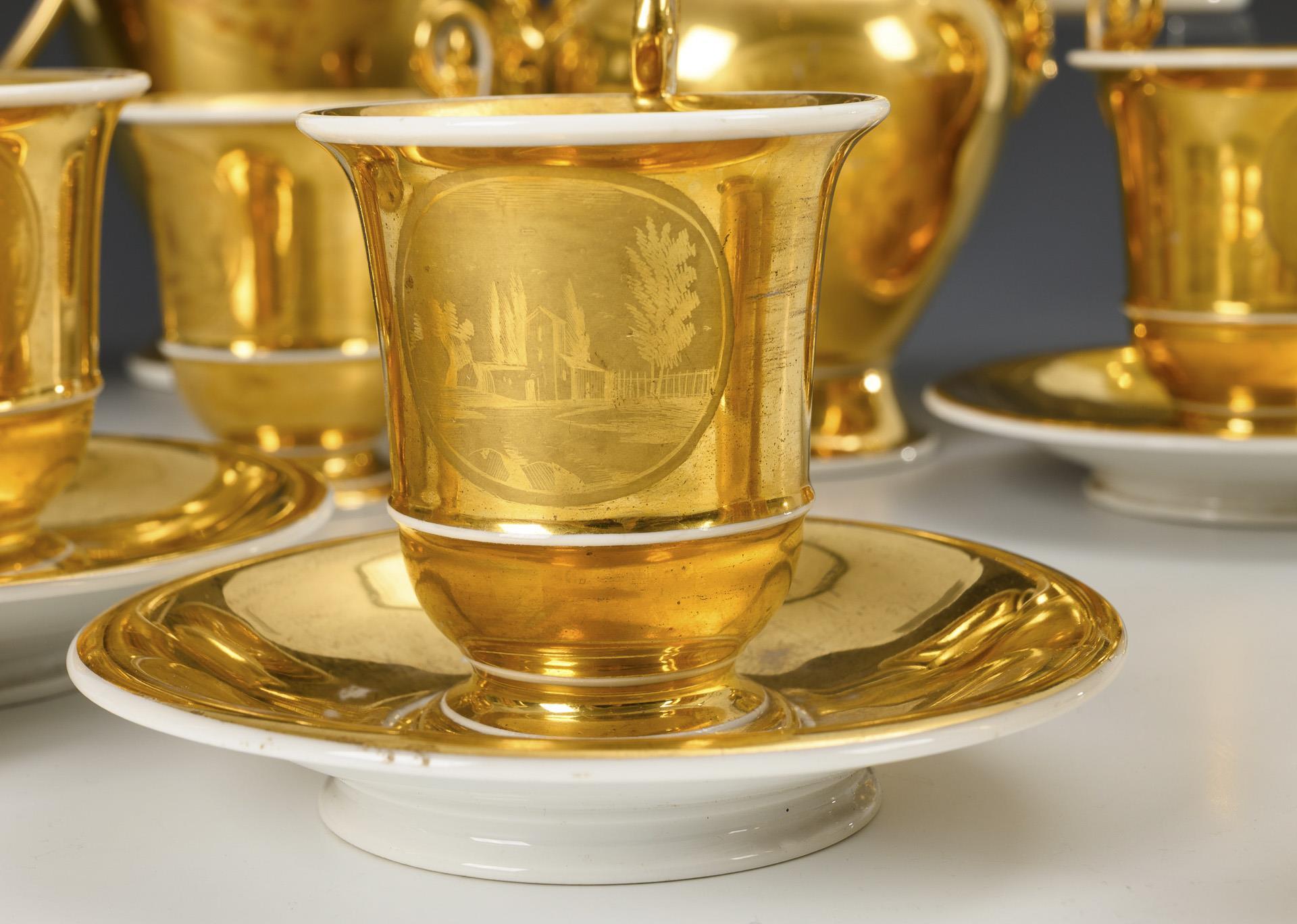 16 parts. Gold ground, medallions with gold etched landscapes on the front. 2 coffee pots (H 26 and 20.5 cm), milk jug, sugar bowl, 8 cups, 3 saucers and 1 rinsing bowl (H 11.5 cm). Partial minimal gold wear, 1 saucer rim, 1 lid nose chipped.