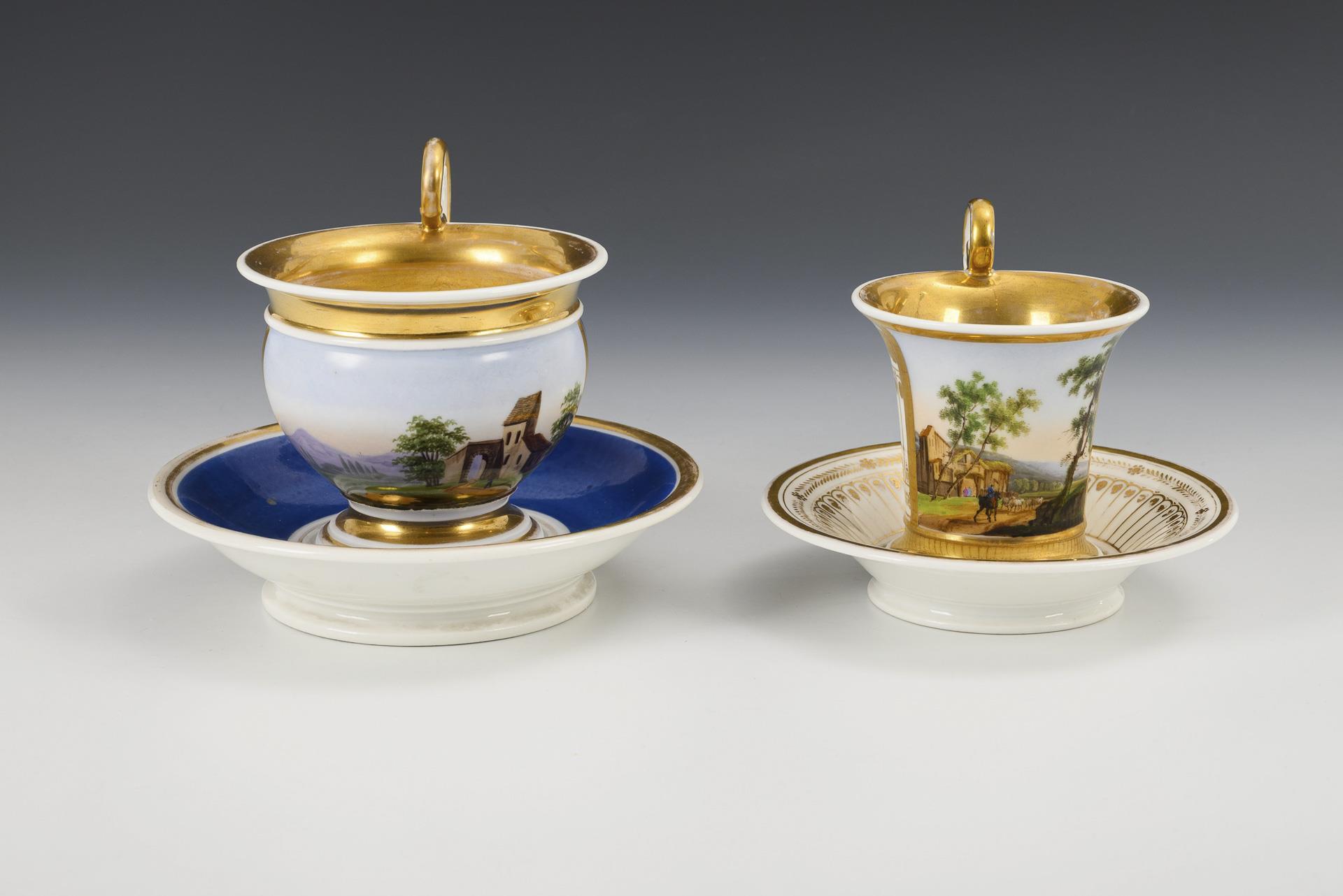 1x footed, bulbous cup with rosette handle, blue partial ground and a depiction of a landscape with ruins on the front (H cup 12 cm, Ø original saucer 16.5 cm). / 1x crater cup with rolled handle and the front depicting a landscape with ruin, rider and sheep, verso partly gold-etched floral and ornamental painting (h cup 10.5 cm, Ø original saucer 14.5 cm). Gold rubbed.