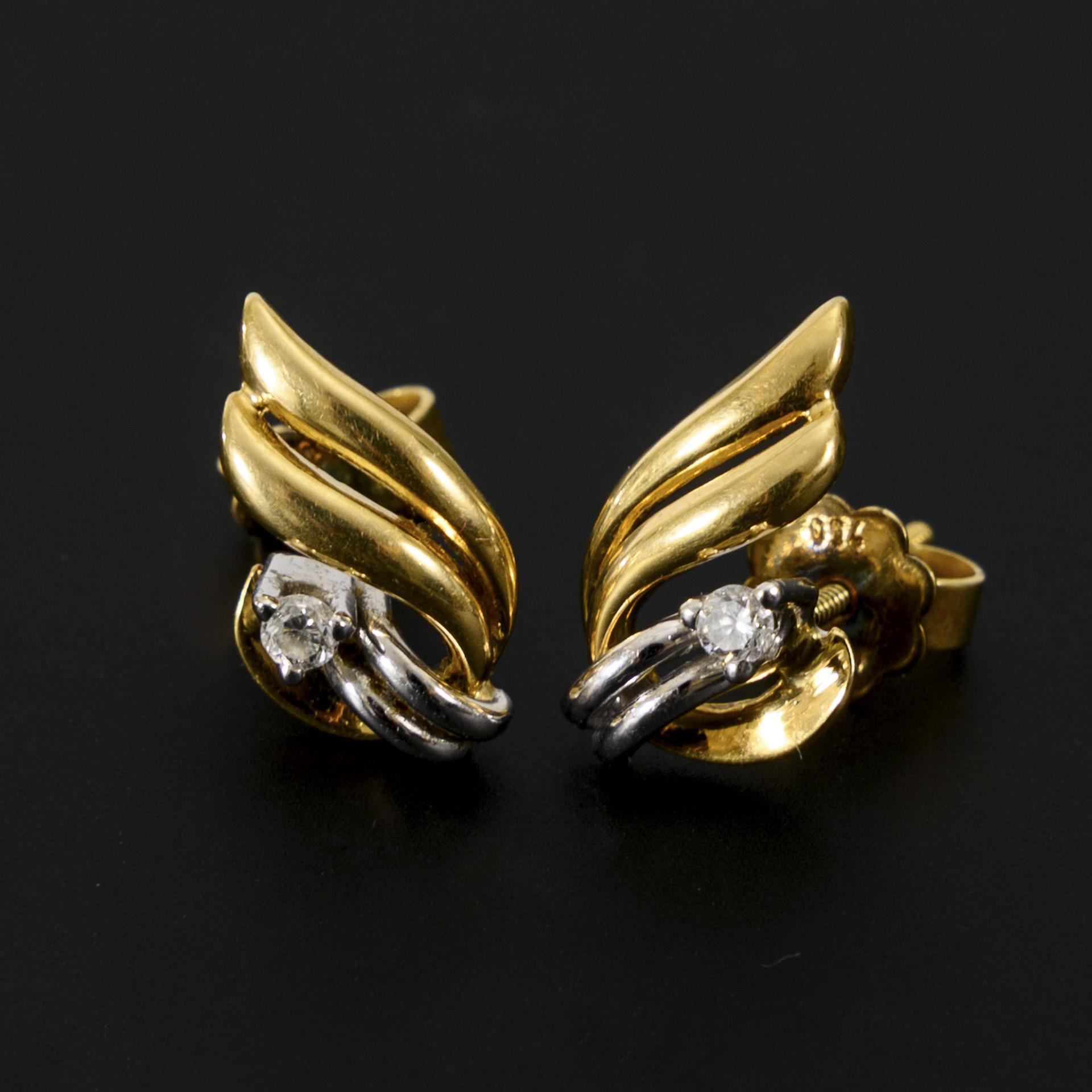 Boldly designed stud earrings, each with a small brilliant-cut diamond in a bicolor design. Screw clasp.