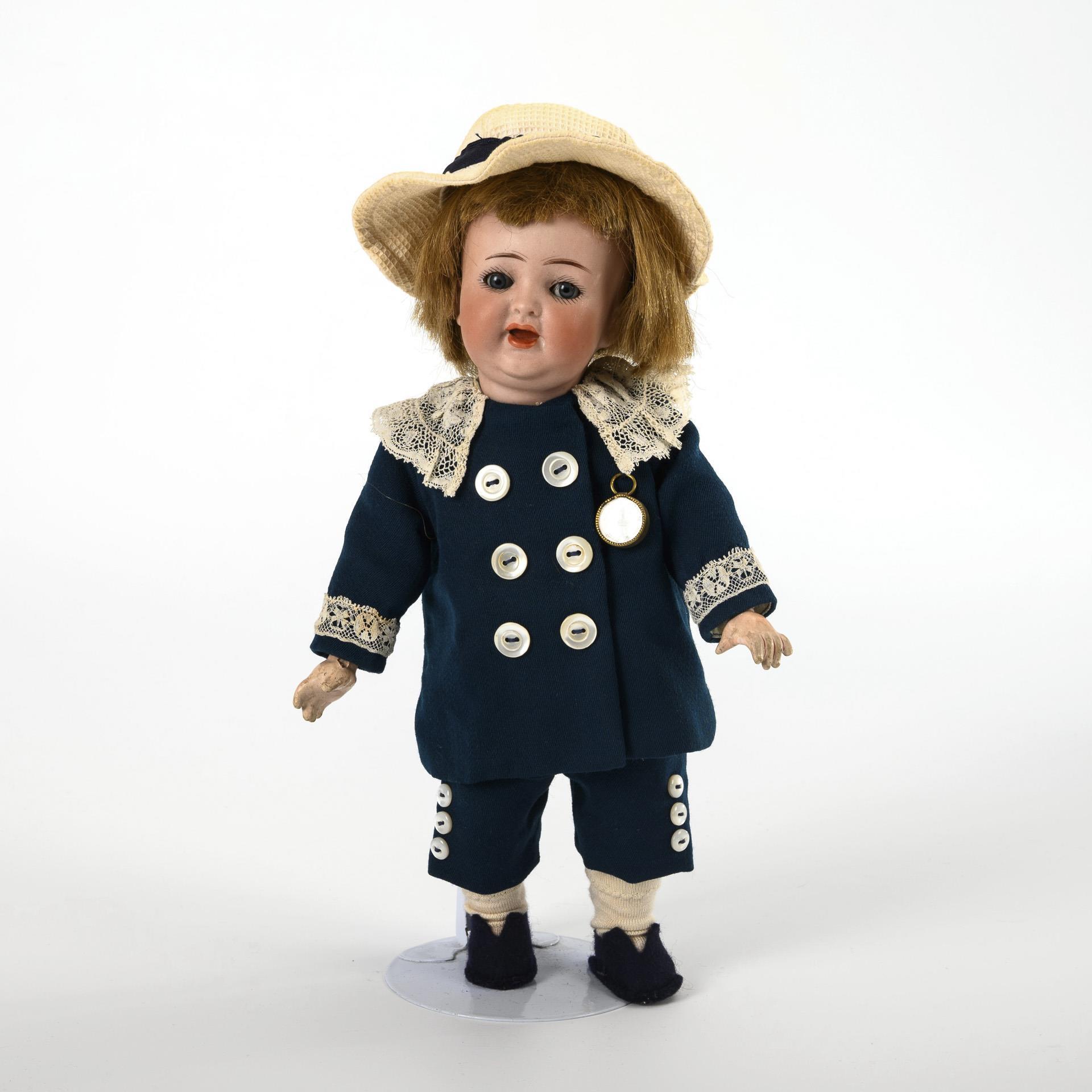 Cranked head, blue sleeping eyes, blonde real hair wig. 11-part toddler body. Petrol-colored suit, white hat, black felt shoes. Head x-rayed: no cracks, only 2 tiny chips in the corners of the eyes.