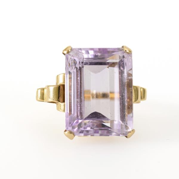Tested yellow gold 585. Ring size 55.5, amethyst approx. 1.9 x 1.5 cm. 8,1 g.
