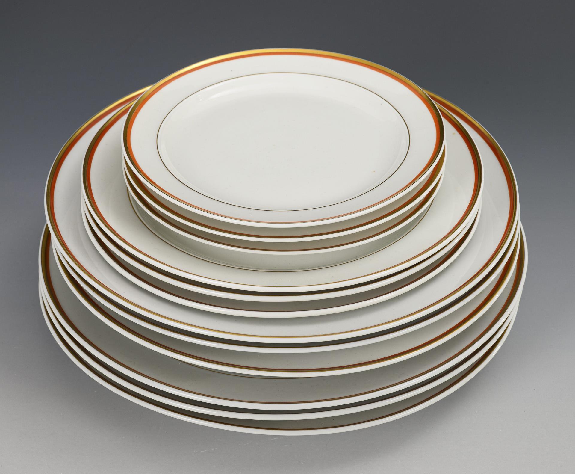 Coral red and gold rim. 3 soup plates (Ø 24.5 cm), 3 dinner plates (Ø 26 cm), 3 salad plates (Ø 20.5 cm) and 3 dessert plates (Ø 16.5 cm. 4.4 kg.