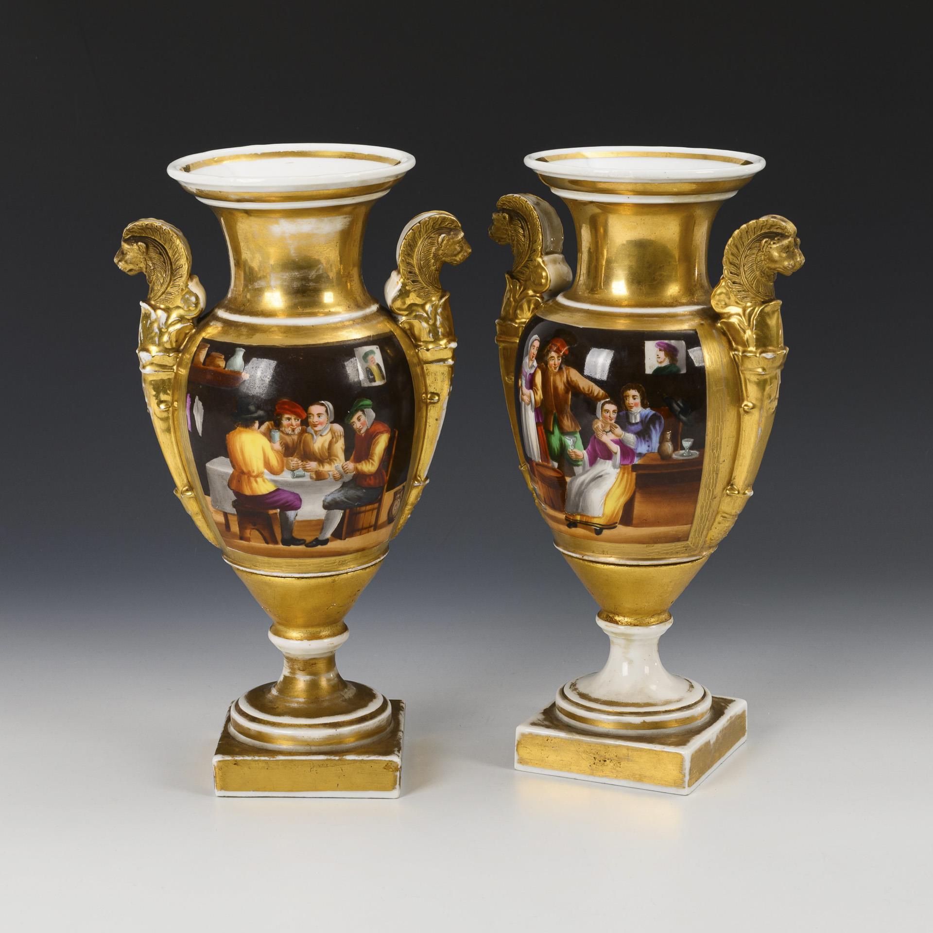 Ovoid body with two lion head handles, crater neck, round foot, on a square plinth. Gold ground, on the front a rectangular cartouche each depicting a tavern scene, on the reverse a gold-etched floral medallion. Gold rubbed, both vases restored at the base of the copus.