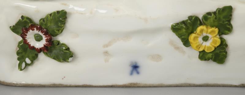1x SAMSON, 2nd half 19th century: three-figure group of gardeners on a flower-covered rock pedestal / 1x SITZENDORF, 2nd half 20th century: seated rococo lady and a cavalier approaching her and handing her a rose. Gardener's group: scuffing to flowers and leaves.