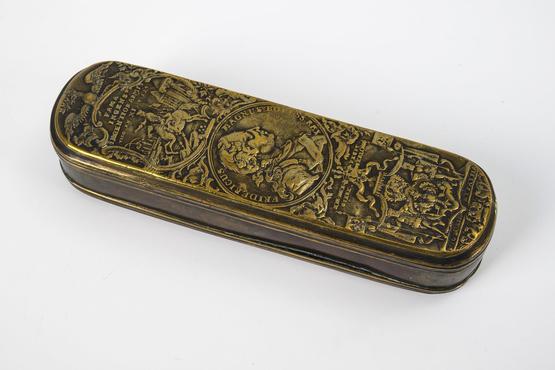 Embossed portrait medallion of the King of Prussia on the hinged lid "Fridericus Magnus Boruss. Rex", flanked by an inscribed coat of arms and a depiction of a cavalryman in an encampment. On the bottom a portrait medallion of Duke Ferdinand of Brunswick, flanked by rocaille cartouches with the Saxon Horse and the Battle of Minden on 1 August 1759. Solder repairs to the narrow sides of the wall, otherwise minor signs of age/use.