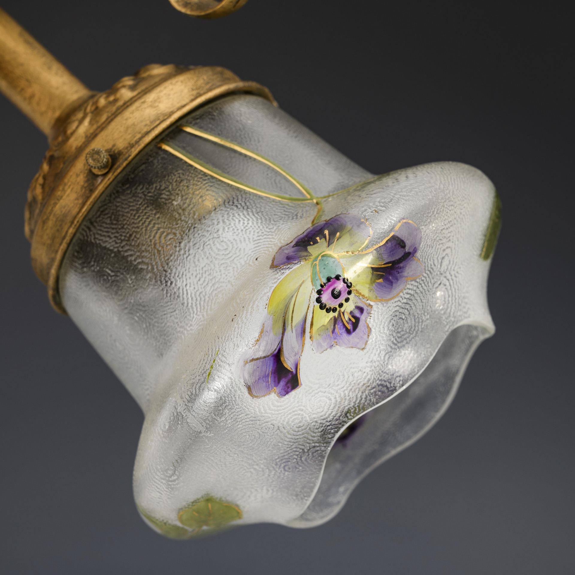 Canopy in the shape of a rosette of leaves, stem with 3 volute-shaped leaves, flower-shaped glass shade with painted flower branches. Minimal chips to the cut glass edges, later gold-bronzed, function not tested.