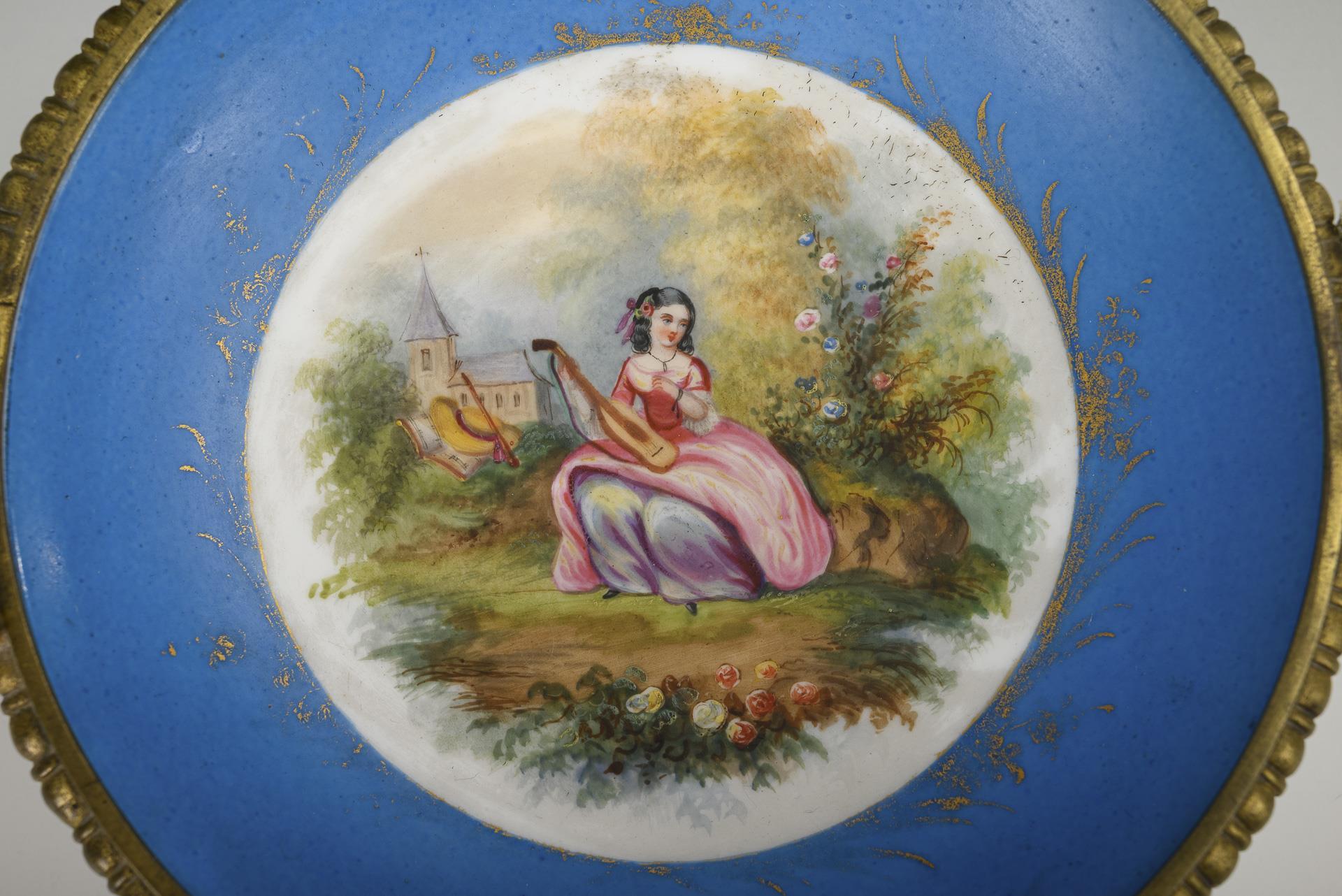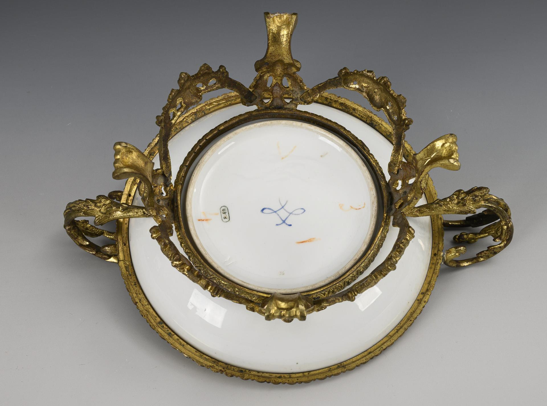 Bowl with a blue base band, the mirror depicting a Biedermeier lady sitting in a landscape with a guitar. Bowl set in a bronze mount (hallmarked "R G") with scrolled leaf handles, flower festoons and four feet. Gold rubbed, bronze regilded?