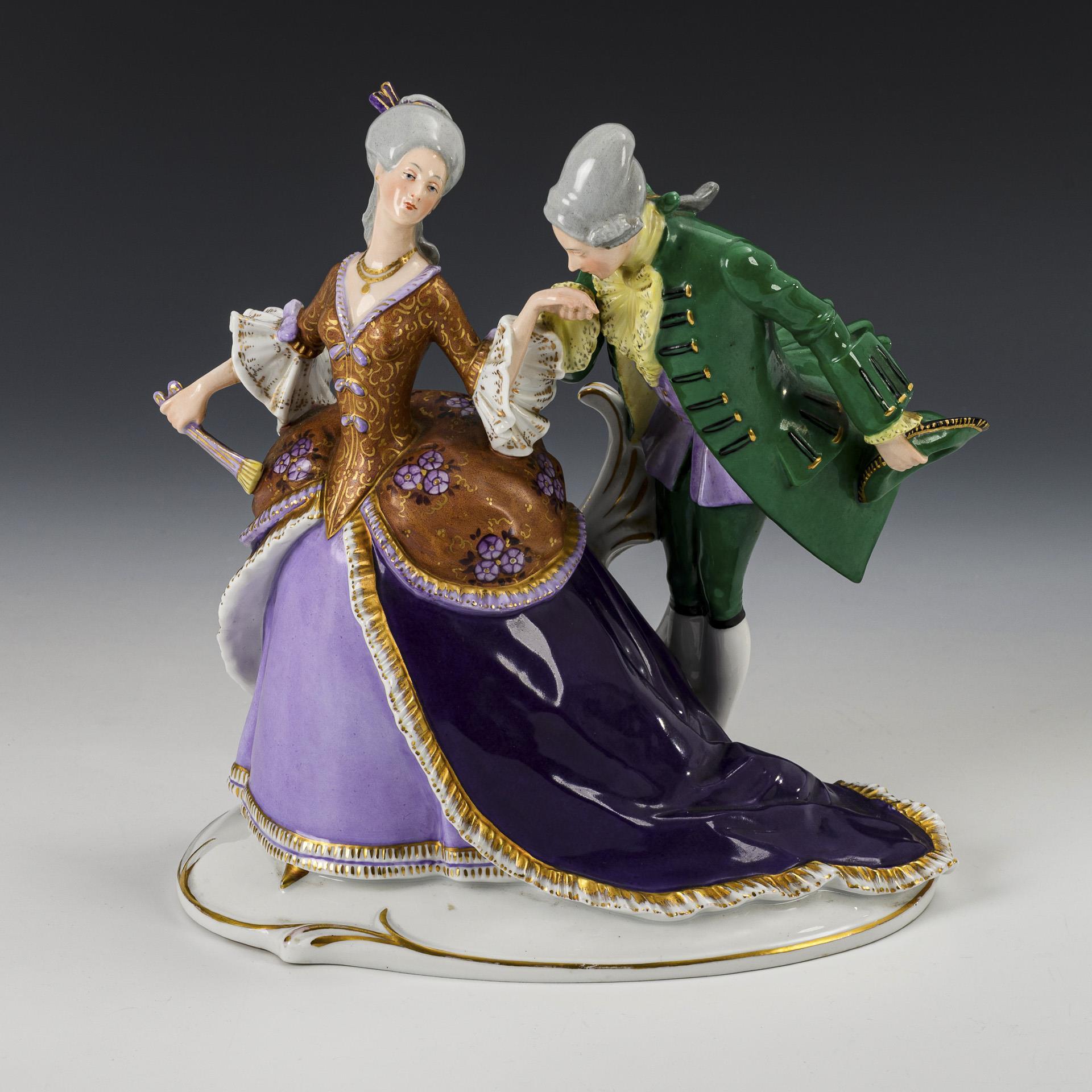 Rococo lady with fan and Rococo gentleman with tricorn hat, kissing the lady's hand.