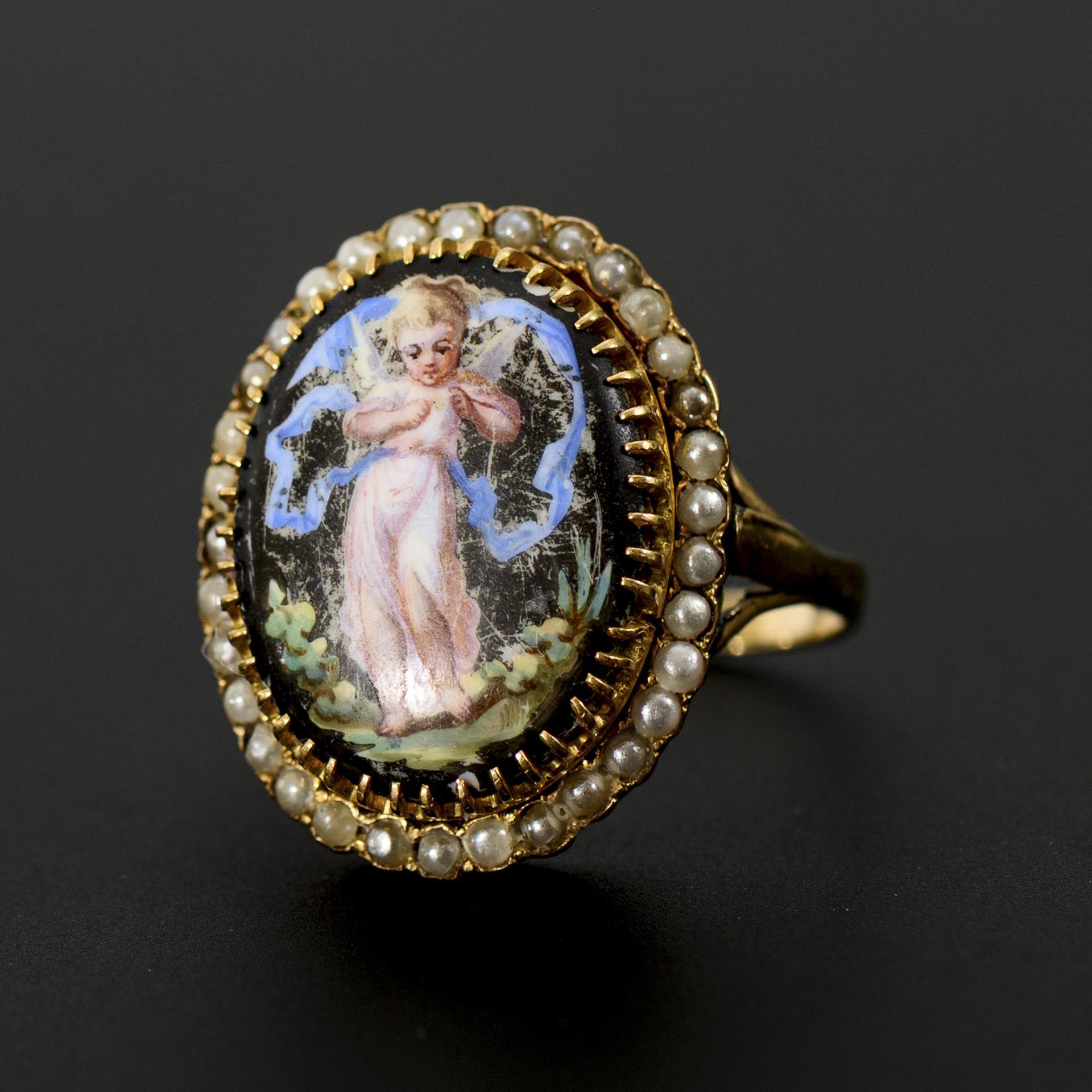 Historical ring, probably circa 1850-80, with a porcelain painting framed by seed pearls, showing a cherub child wrapped in a translucent pale pink robe and holding a flower in her hand. The porcelain painting with losses of color and traces of wear.
