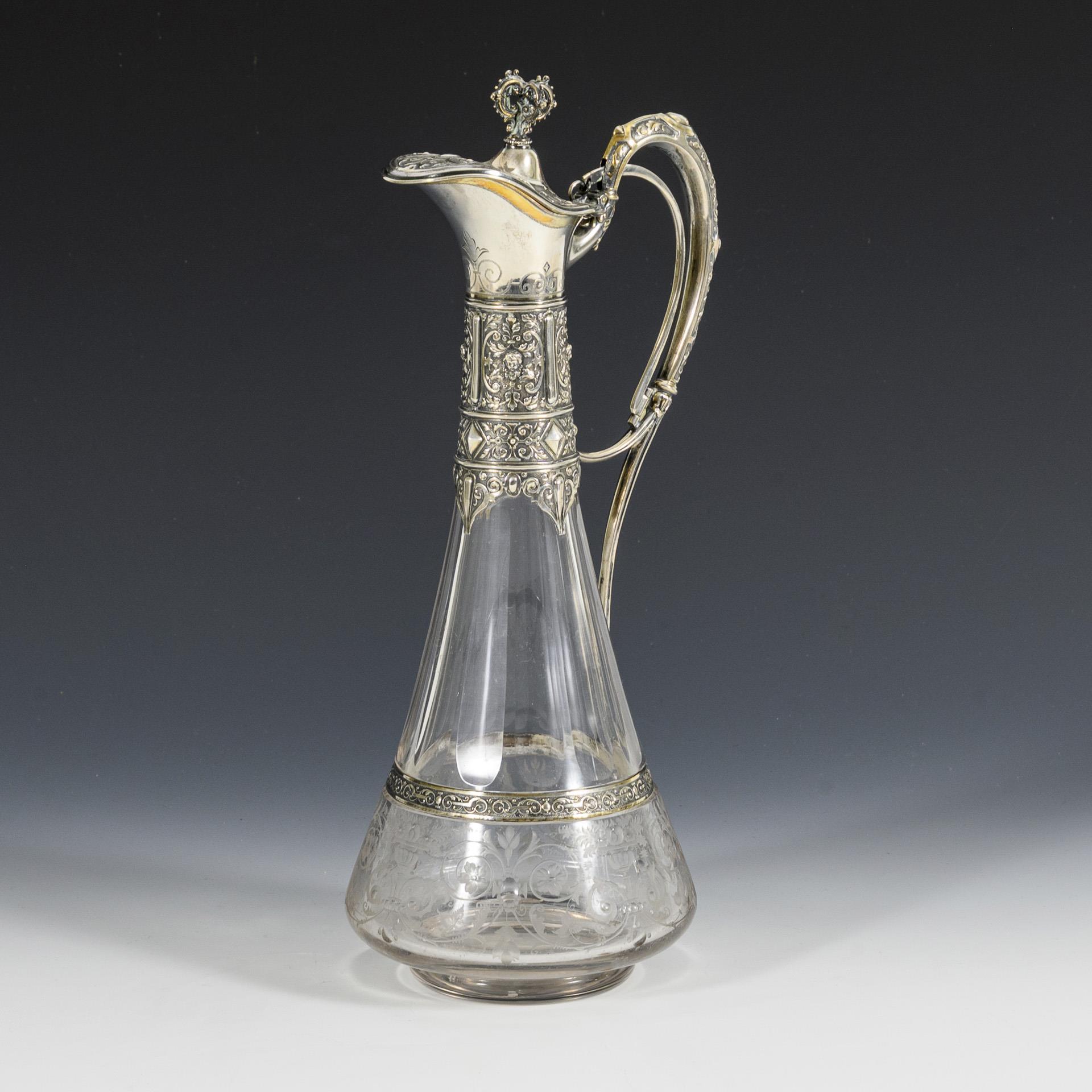 Bell-shaped glass body with silver mounting in rich relief and patented hinged lid.