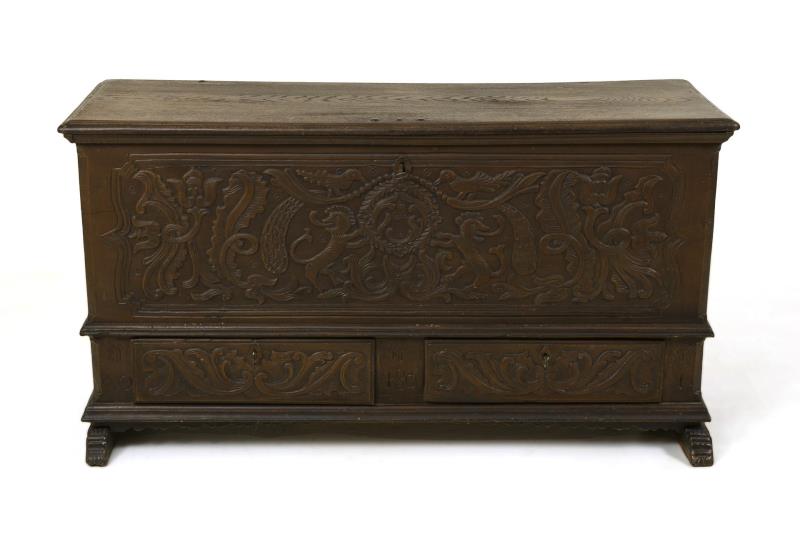 Chest with projecting hinged lid and 2 plinth drawers, moldings, curved plinth frame, on 2 sled feet. Lively relief carvings on the front with a central wreath motif, surrounded by 2 lions and 2 birds as well as curved leaves, rocailles and flowers. Dated "A[nn]O 1801" on the base. Iron handles on the sides, hinge with studded iron bands, iron lock, brass keyhole fittings. Inside a sideboard with a slightly jammed lid. Slight signs of age and wear, partially cracked.
