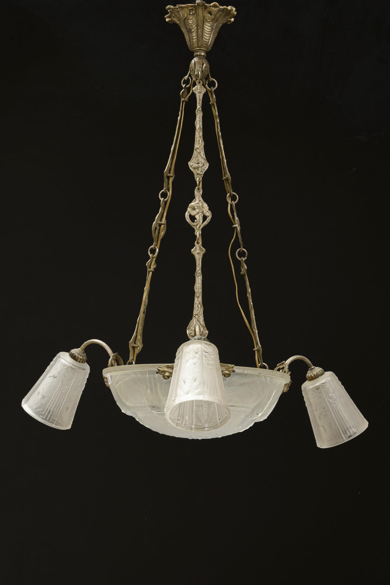 Glasses each with geometric relief ornament. On the central lamp bowl, brackets in vegetal relief for the 3 arched arms with bell-shaped lampshades and 3 decorative chains in vegetal relief to the canopy with relief decoration. Function not tested.