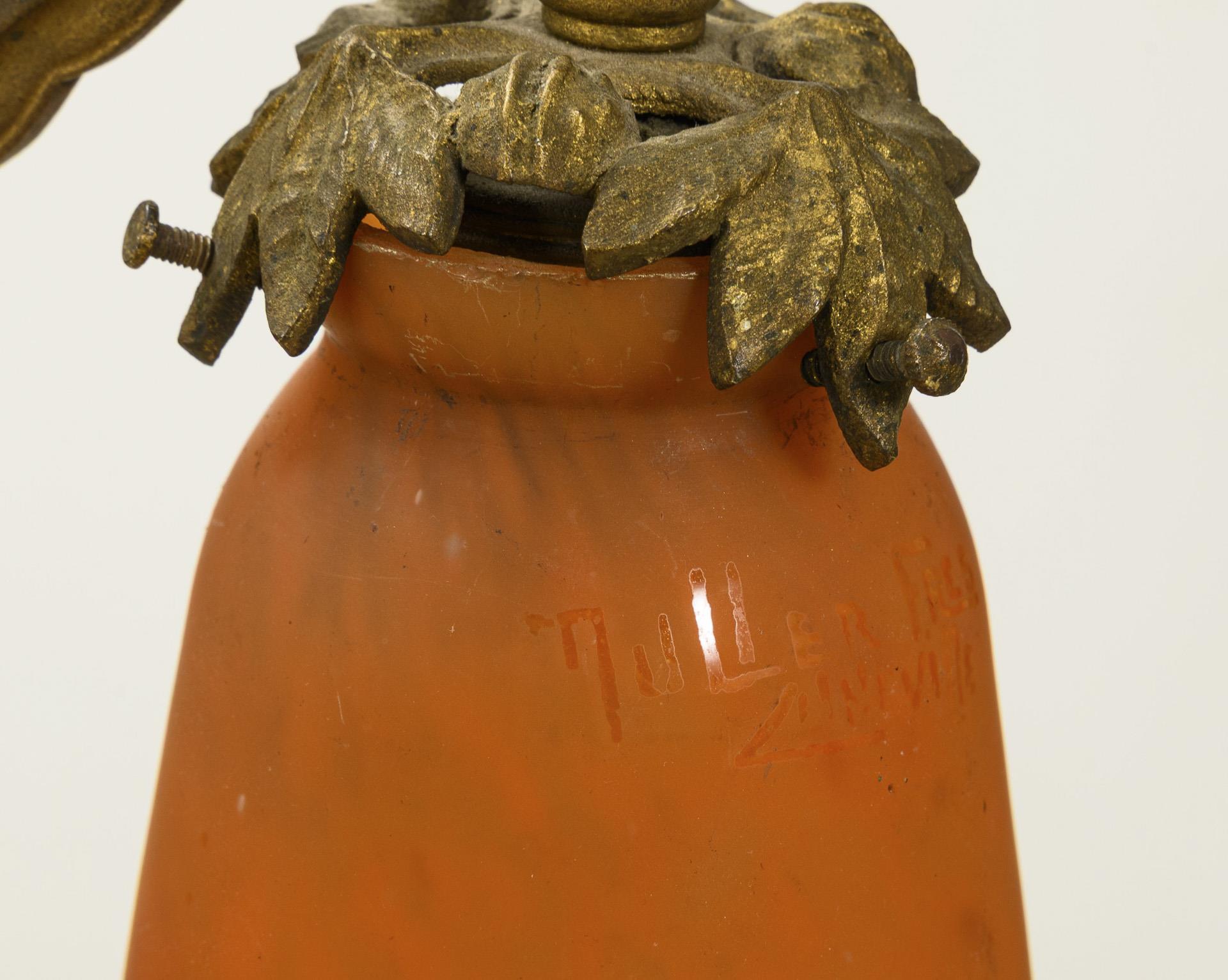 Satin-finished clear glass with orange and blue powder meltings, bronze bronzed in gold, electrification with screw mount. H 55 cm, Ø bowl 37 cm, W maximum 62 cm. 8.0 kg.