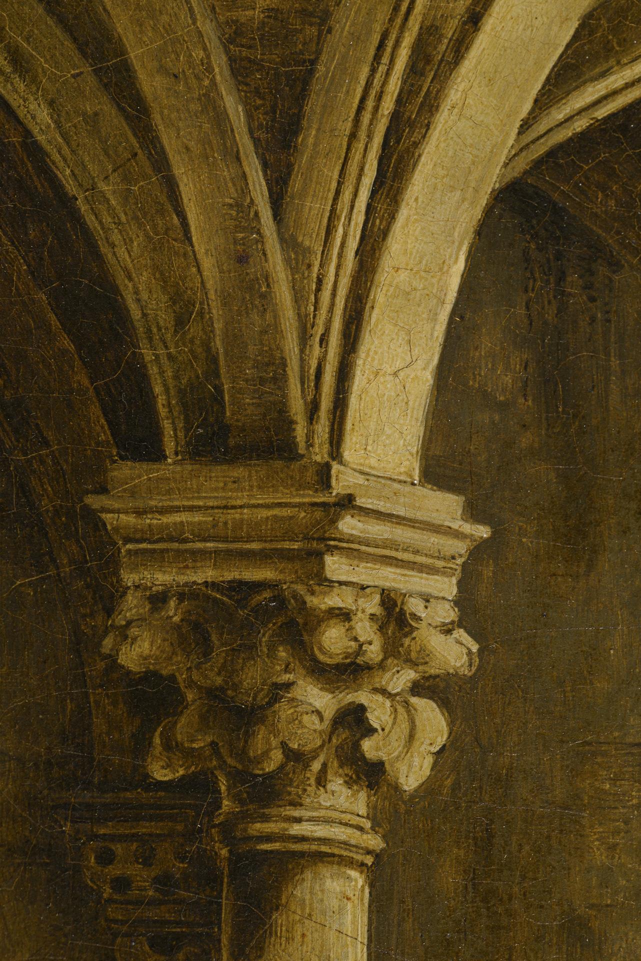 Staffage figures looking at the ribbed vault in the church. Slight traces of age.