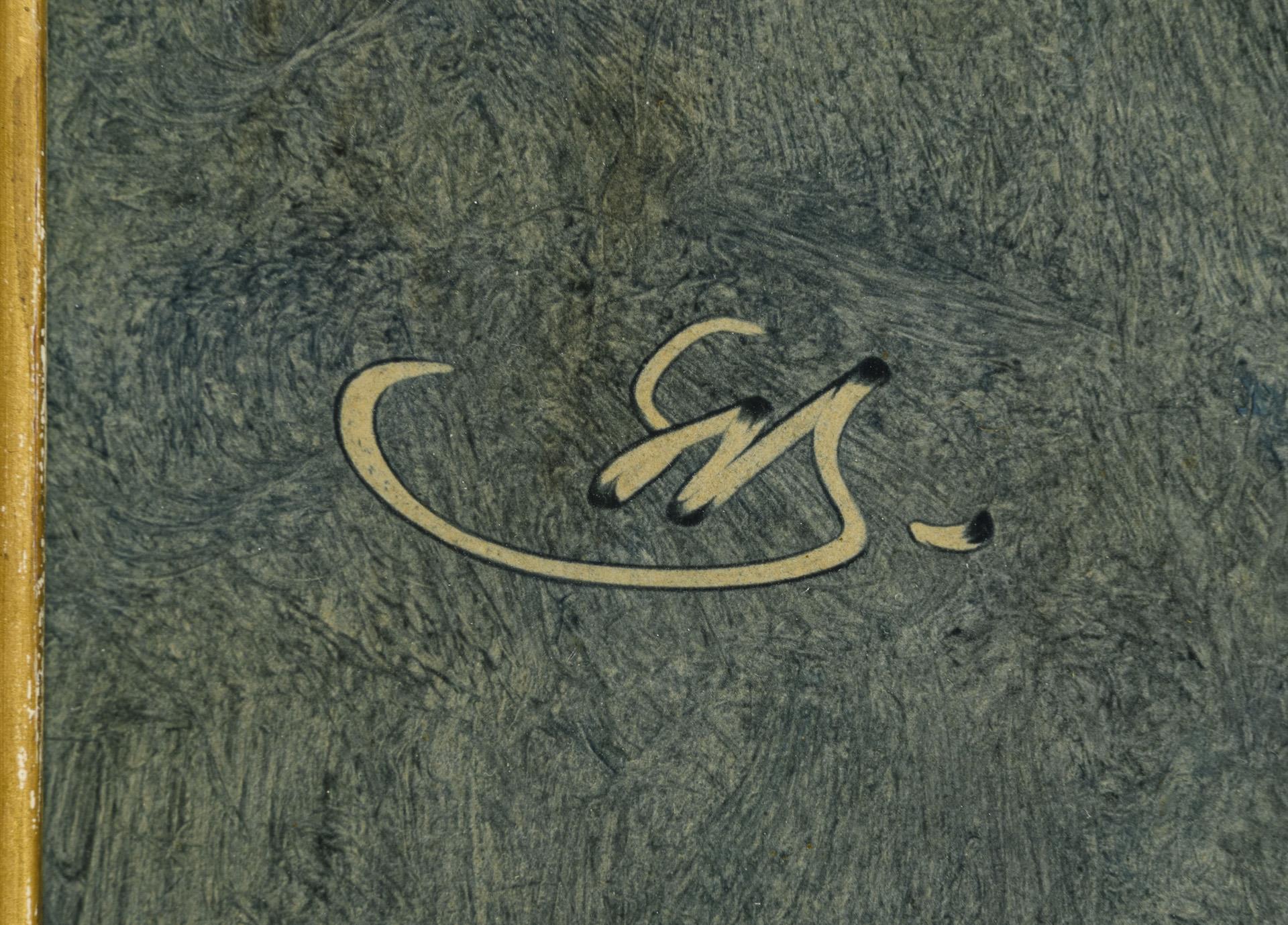 44.5 x 34 cm. Framed & behind glass : 75 x 65 cm (gold stucco frame on dark lacquer frame); 9.2 kg.