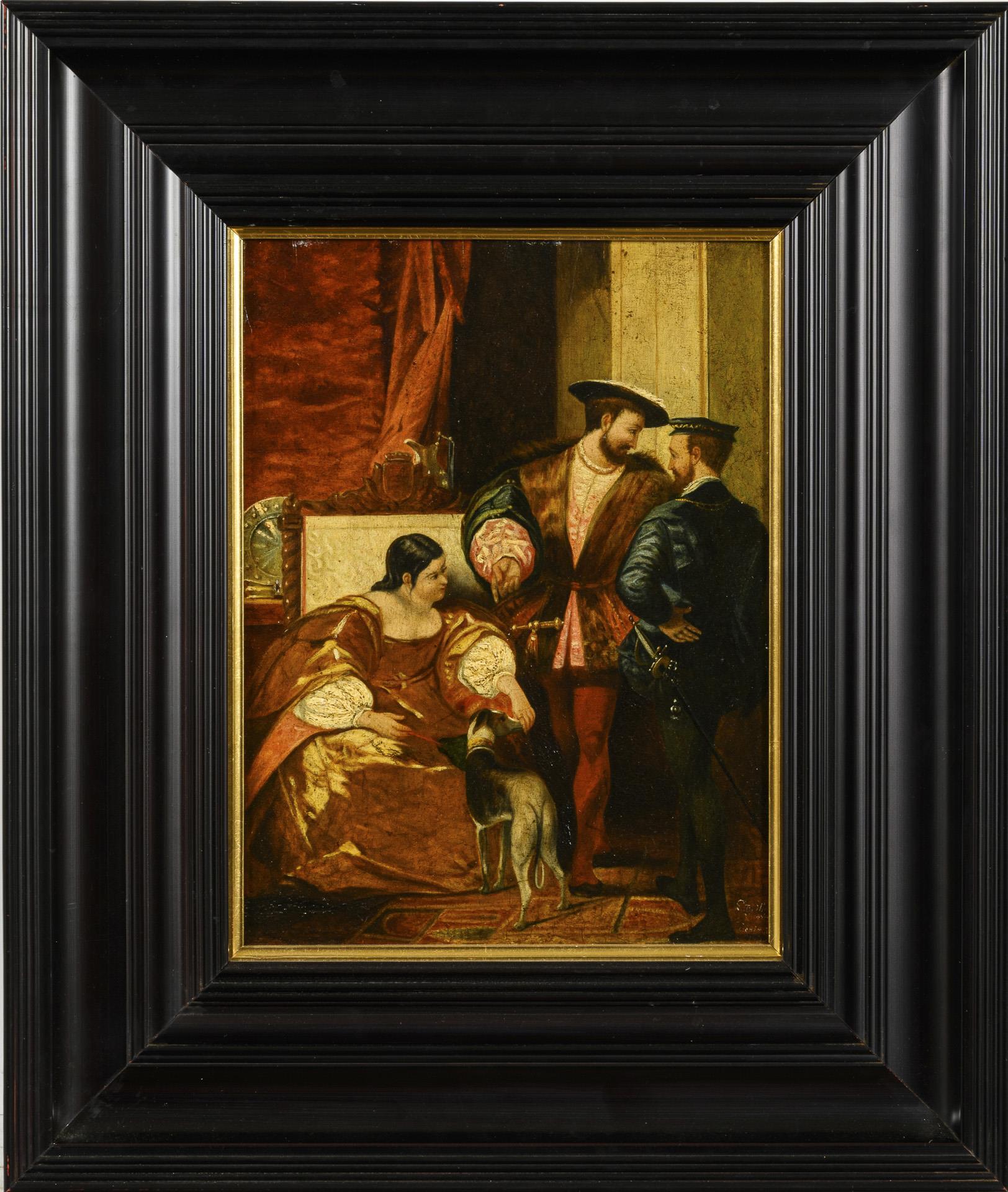 The two noblemen in conversation next to a lady in a voluminous dress with a dog. Traces of age.
