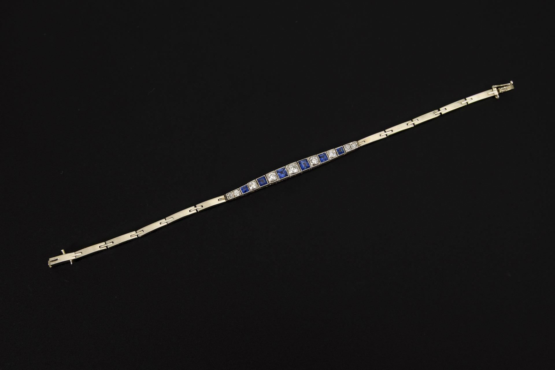 Art déco bracelet with old-cut diamonds and blue colored stones.