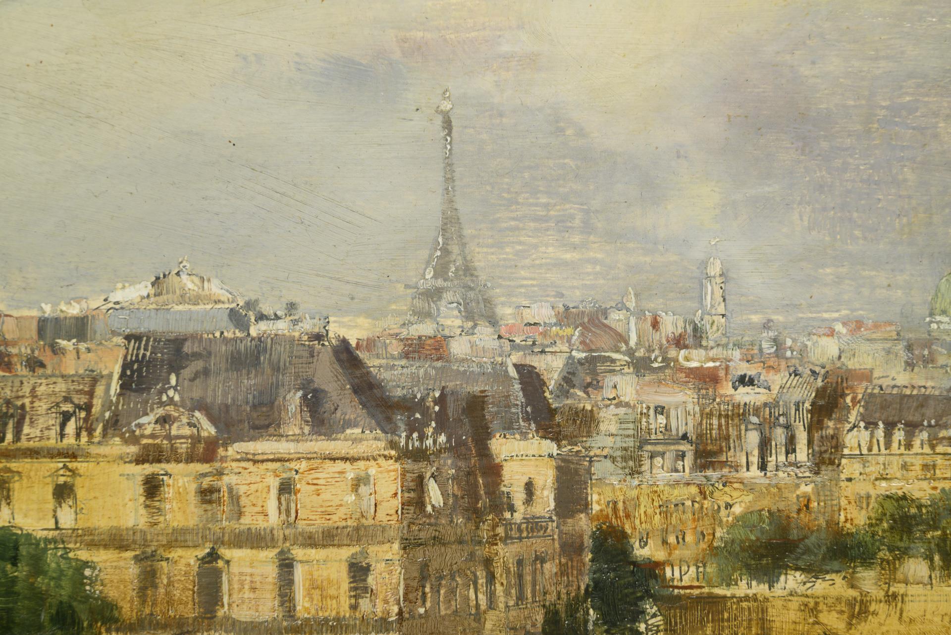 Bustling activity on the streets of the French capital in the sunshine. Slight traces of age.